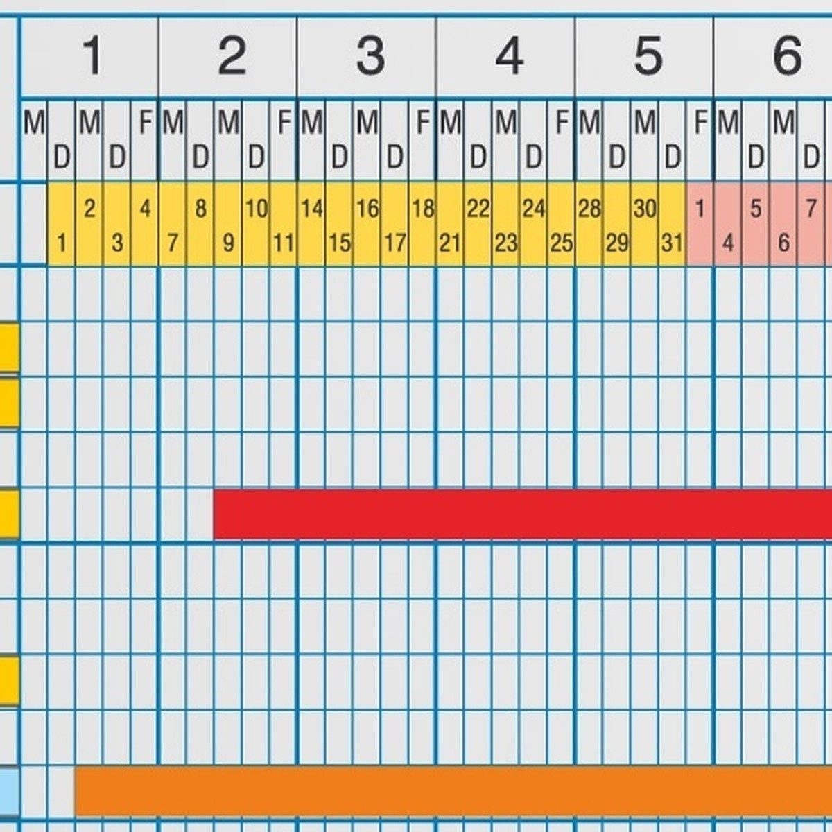 • Kalendergerechte Tagesstreifen 1-31 abwechselnd in drei Farben inkl. Folgejahr,