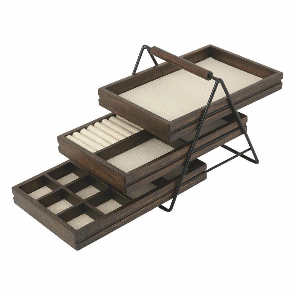 Das Terrace Schmucktablett von Umbra besteht aus gestapelten Holztabletts, die sich ausziehen lassen und somit einen einfachen Zugriff auf Ihren Schmuck ermöglichen. Dank der mit Leinen überzogenen Trennstege werden Ringe, Armreifen Halsketten separat aufbewahrt. Mit praktischem Transportgriff.