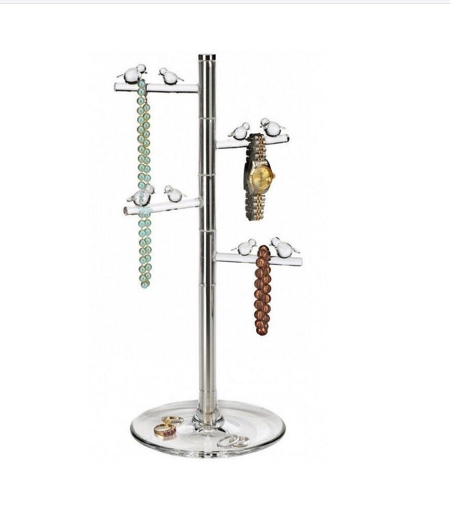 Welche Frau kennt es nicht, viel zu viel Schmuck und viel zu wenig Platz.Für dieses Problem hat der Hersteller Umbra eine pfiffige Lösung gefunden. Der Schmuckbaum in Form eines Bäumchens, auf dem viele kleine Vögelchen sitzen.Ihre schönen Schmuckstücke finden Platz an vier schwenkbaren Ästen. Der Baumstamm ist aus Edelstahl und somit äußerst robust und standhaft.