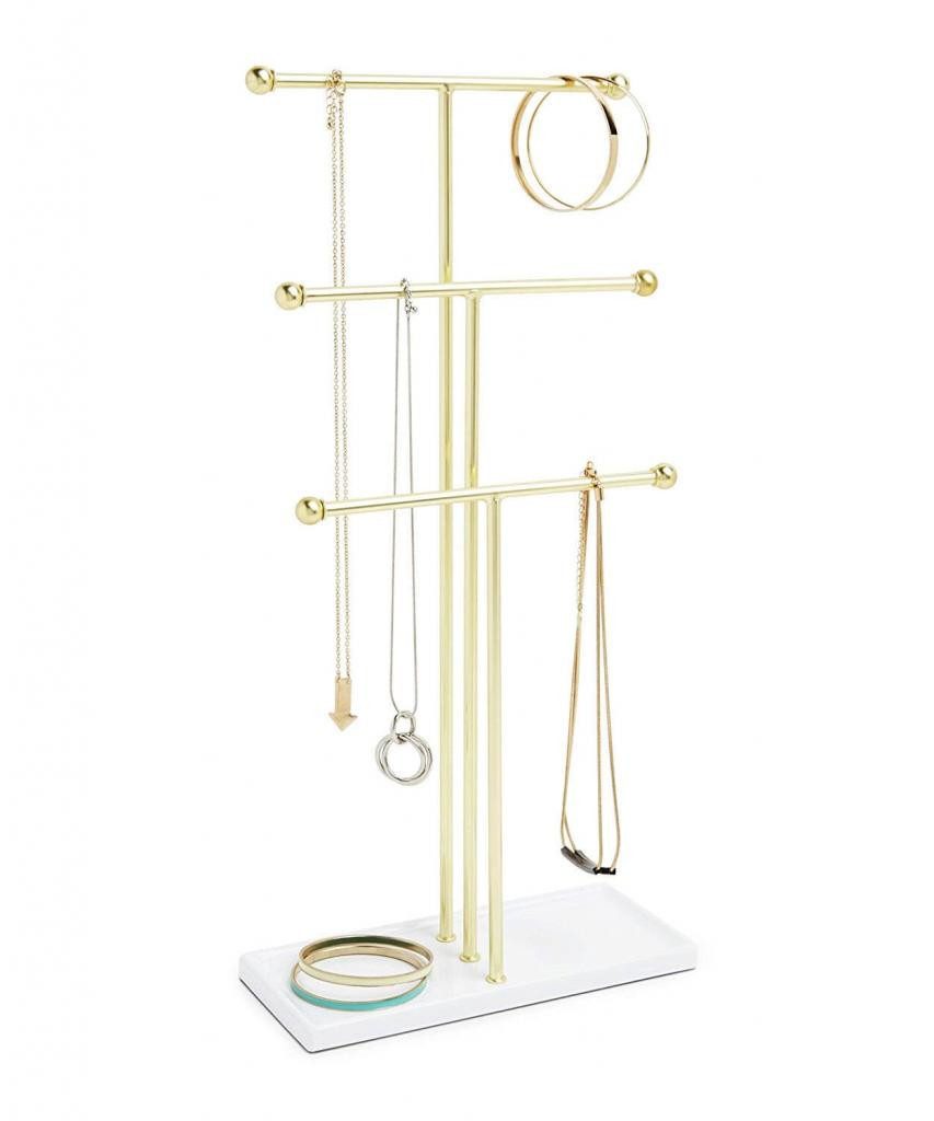 Kennen Sie die unordentlich verwickelten Halsketten, die öfter in Ihrem Schmuckkästchen oder in der Schublade erscheinen als erwünscht? Das ist ab sofort kein Problem mehr, denn der Umbra TRIGEM-Schmuckständer bietet durch seine drei Stangen viel Stauraum, sodass Sie alle Ihre Halsketten ausbreiten können und sie sich nicht mehr verwickeln! Mit seinem schlanken und schlichten Design dient der Umbra TRIGEM Schmuckständer zusammen mit Ihren Lieblingsschmuckstücken als modernes Dekorationselement, welches Sie überall ausstellen können, um Ihrem Wohnraum noch mehr Stil zu verleihen. Die gepolsterte Unterlage sorgt dafür, dass Ihre Oberfläche nicht beschädigt wird. Artikelmerkmale: - 3 Stufen für verschiedene Kettenlängen - Bodenschale für Ringe, Armbänder, Uhren und Ohrringe - Weiß- und Goldfarben - Schlankes und schlichtes Design - Maße : 23cm x 10cm x 48cm - Gewicht : 0,726 kg Lieferumfang: - Umbra Trigem Schmuckständer in weiß/goldfarben