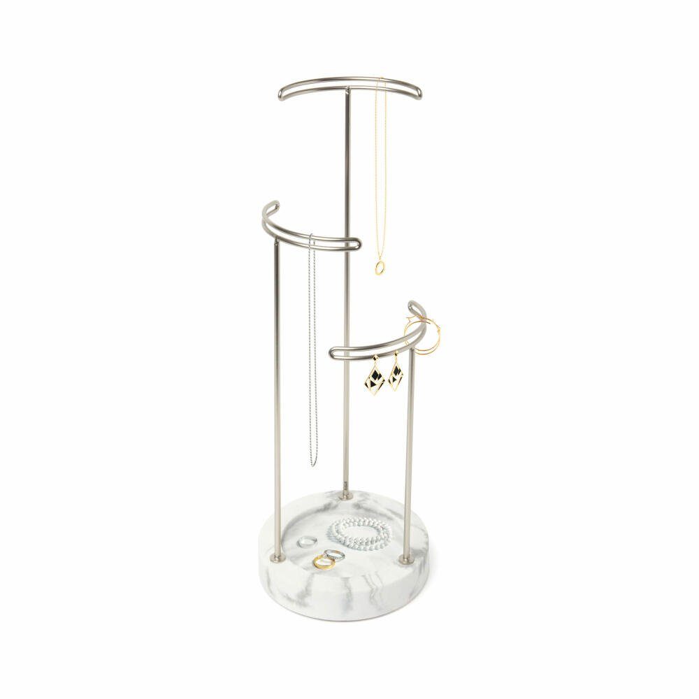 Modernes Design: Seine außergewöhnlichen Materialien lassen den Tesora Schmuck Ständer nicht nur schön aussehen, sich machen ihn auch zu einer sehr funktionalen Ketten Aufbewahrung: seine silberfarbenen Metallstangen und die weiß, marmorierte Ablageschale aus Kunstharz machen ein starkes Statement. Tesora’s niedrige, mittlere und hohe Stange bieten Platz für Schmuck aller Длинаn und ist sowohl für Halsketten jeglicher Длина als auch für Halsbänder, Armbänder, Armreifen, Ohrringe, Ohrstecker, Ringe und mehr geeignet. Все 3 Querstangen sind aus doppelten Metallstreben gefertigt was Ihnen ideale Aufbewahrung für Ihren Ohrschmuck bietet. Der vielseitige Tesora Kettenhalter verfügt auch über eine integrierte Schmuckablage für Armbänder, Uhren, Ohrringe, Ringe und andere Accessoires: zudem ist die aus Gussbeton gefertigte Schmuckablage ein hervorragender Beschwerer, der Tesora seinen festen Stand verleiht. Von Sung Wook Park für Umbra entworfen: Der schlichte und formschöne Tesora Schmuck Ständer misst 41 cm in Höhe und 16 cm im Durchmesser: die Unterseite der Basis ist mit einem Filz Schutzpad versehen, um Kratzspuren auf Oberflächen zu verhindern.