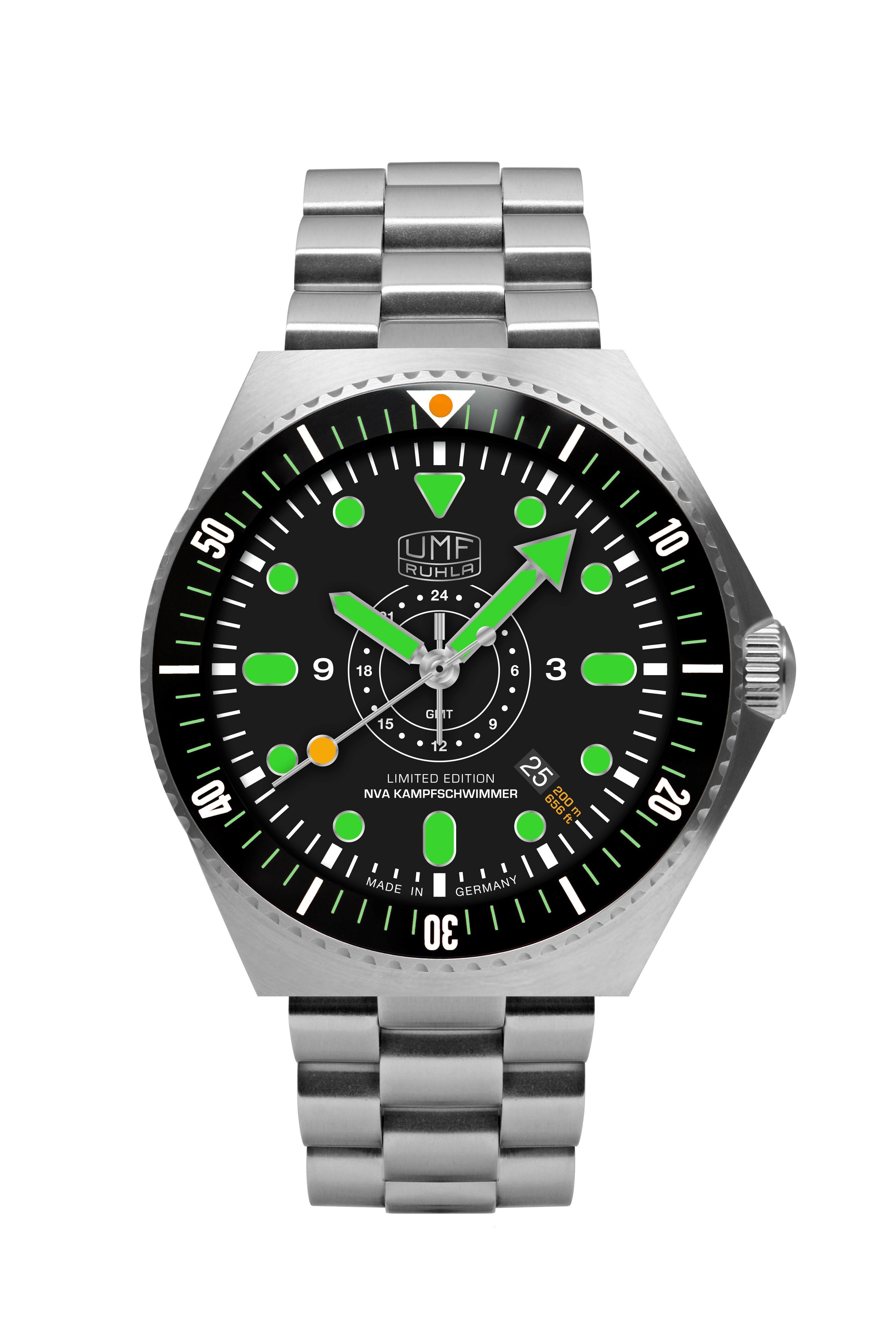 Farbe Zifferblatt: schwarzes mit grünen Leuchtindexen