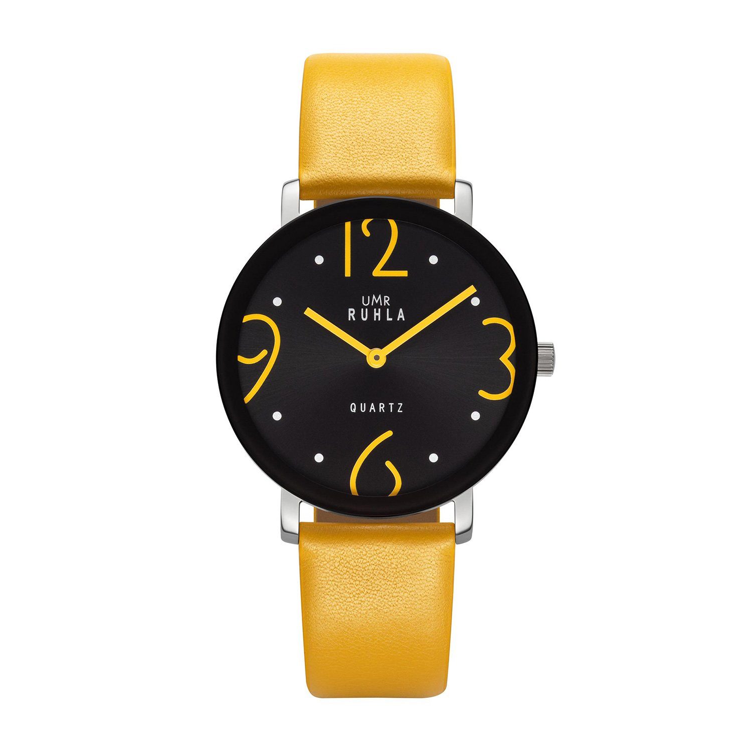 • Schwarzes Zifferblatt mit gelben Zahlen und weißen Punkten
