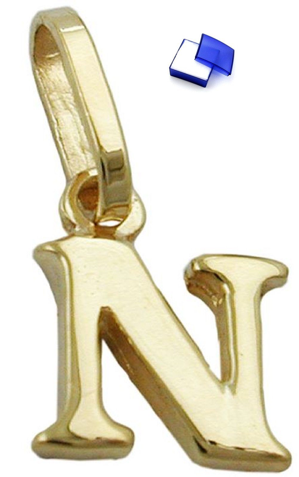 Stilvoller Schmuckanhänger in 375er Gold (9 Karat) als Großbuchstabe N. Mit diesem 8x7mm kleinen, glänzenden und kompakten Buchstabenanhänger können die eigenen Initialen oder die Anfangsbuchstaben des geliebten Menschen dezent präsentiert werden. Ein zeitloses und universell tragbares Schmuckstück und kostbares Geschenk zur Geburt, Taufe, Geburtstag oder einfach mal als kleine Überraschung zwischendurch.