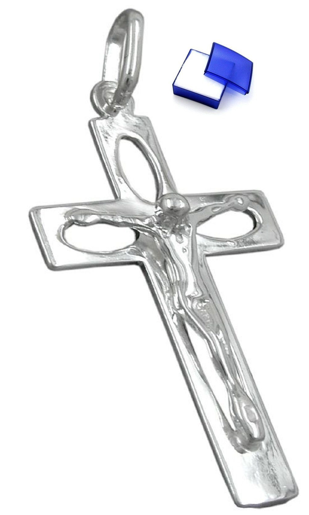 Modern gestalteter Silberkreuz Kreuzanhänger Anhänger Kruzifix in Sterling Silber 925 in hoher Juwelierqualität. Ein besonderer Blickfang ist das blütenähnlich durchbrochene Kreuz, das dadurch weicher und lieblicher wirkt. Das Jesuskreuz ist ein perfektes Geschenk für christliche Menschen zur Taufe, Kommunion oder Konfirmation. Es wird als ein persönliches Bekenntnis zum christlichen Glauben getragen, wobei das Kreuz mit Jesus überwiegend von Menschen mit römisch-katholischem Glauben getragen wird und Menschen mit evangelischem Glauben das (schlichtere) Kreuz ohne Jesus bevorzugen.