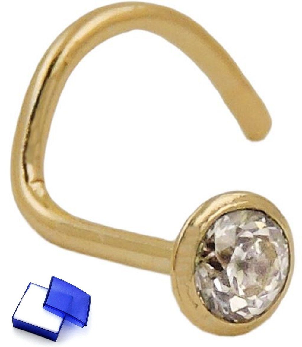 Dezent aber doch schmückend - weniger ist manchmal mehr - ist dieser 2,5mm kleine, gebogene Nasenstecker mit kleinem kristall-weißen Zirkonia und Spirale aus 750er Gold (18Karat). Die Steglänge beträgt 5mm und die Stabstärke 0,6mm. Achtung: dieser Nasenschmuck hat aus Sicherheitsgründen keinen Feingehalt-Prägestempel! Das Piercing durch die Nasenflügel (Nostril-Piercing) zählt wie das Ohrloch-Piercing zu den ältesten Piercing-Вариантыn der Welt.