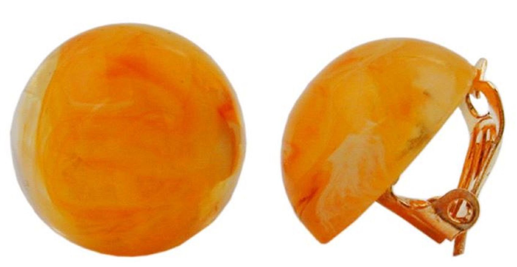 Wunderschöner sommerlich leichter Ohrclip, 17mm groß und halbrund gewölbt, 8mm hoch, passt farblich auch gut zu echten Bernsteinketten. Der orange-gelb-transparent-marmorierte Kunststoff-Bouton ist mit weißen und braunen Fäden durchzogen, jeder Ohrring ist dadurch einzigartig. Die goldfarbene Clipmechanik ist aus Messing. Все Bestandteile dieser Modeschmuck-Ohrringe wurden in Deutschland produziert. Verkauf paarweise..