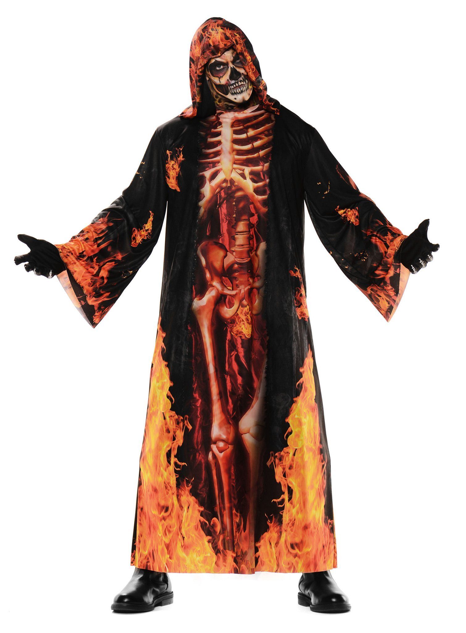 Das gruselige Feuerskelett Einteiler Kostüm kommt als schwarze Robe mit Kapuze daher und ist mit einem menschlichen Skelett bedruckt, das von zahlreichen Flammen umgeben ist