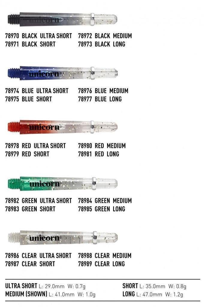 Unicorn Gripper 4 Elements Two Tone Shaft L / Transparent Unicorn Gripper 4 Two Tone. Ein speziell geformter Schaft aus Polycarbonate. Die Flights können leicht eingeführt werden und werden sicher im Schaft gehalten. Zusätzliche Unterstützung beim Halten des Flights durch einen Schaft Ring. Dieser Schaft Typ ist in fünf Farben und vier Длинаn, sowie mit dem 2BA Gewinde lieferbar.X-Short: Длина: 29,0mm, Gewicht: 0,7g.Short: Длина: 35,0mm, Gewicht: 0,8g.Medium: Длина: 41,0mm, Gewicht: 1,0g.Long: Длина: 47,0mm, Gewicht: 1,2g.
