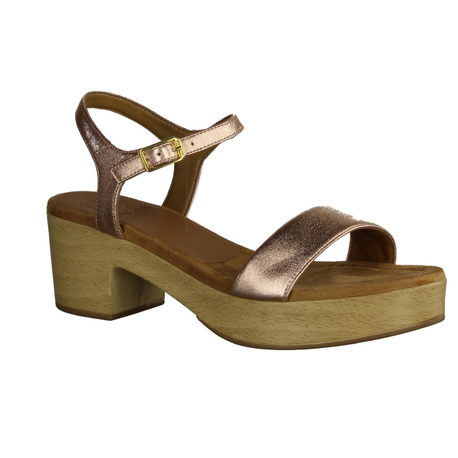 Die Damensandale von UNISA ist eine elegante und feminine Blocksandale für den Sommer. Sie besteht aus hochwertigem Leder mit Metalliceffekt das in einem zarten Rosa-Ton gehalten ist. Die elegante geschwungene Linienführung endet an einer runden Zehenspitze. Ein schmales Vorderblatt schmückt den offenen Zehenbereich und unterstützt die Passform. Verschlossen und individuell eingestellt wird die meisterhafte Sandalette mit einer Metallschnalle am Knöchel. Durch die schmale Form und den Absatz von etwa 55 cm wirkt sie sehr feminin und glamourös. Unterstrichen wird das feminine Design durch das 30 mm hohe Plateau in sommerlicher Holzoptik Die Decksohle und das Innenfutter sind aus einem Leder/Synthetikmix gefertigt und bieten ein weiches, angenehmes Tragegefühl. Auch bei der Laufsohle wird auf den Einsatz von hochwertigem Material geachtet. So besteht sie aus leichtem und rutschfesten Gummi. Mit der UNISA Irita Sandalette kannst du stilvoll deine Beine präsentieren und dein Outfit auf elegante Weise abrunden. Ein Klassiker der jede Saison immer wieder neu erscheint.