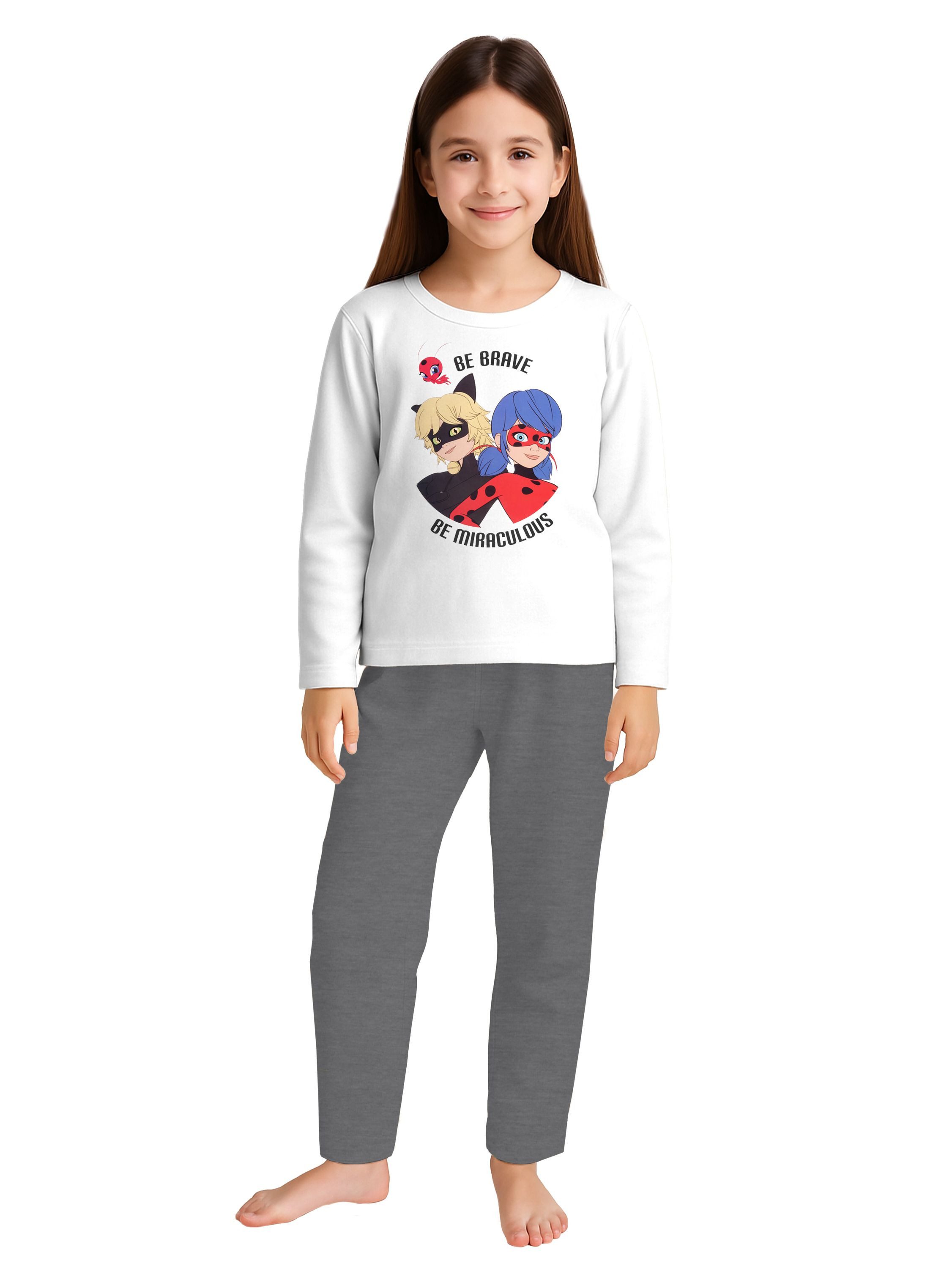 Miraculous Schlafanzug für Mädchen - Ladybug Kinder Pyjama Set Langarm Oberteil mit Hose Weiß/Grau