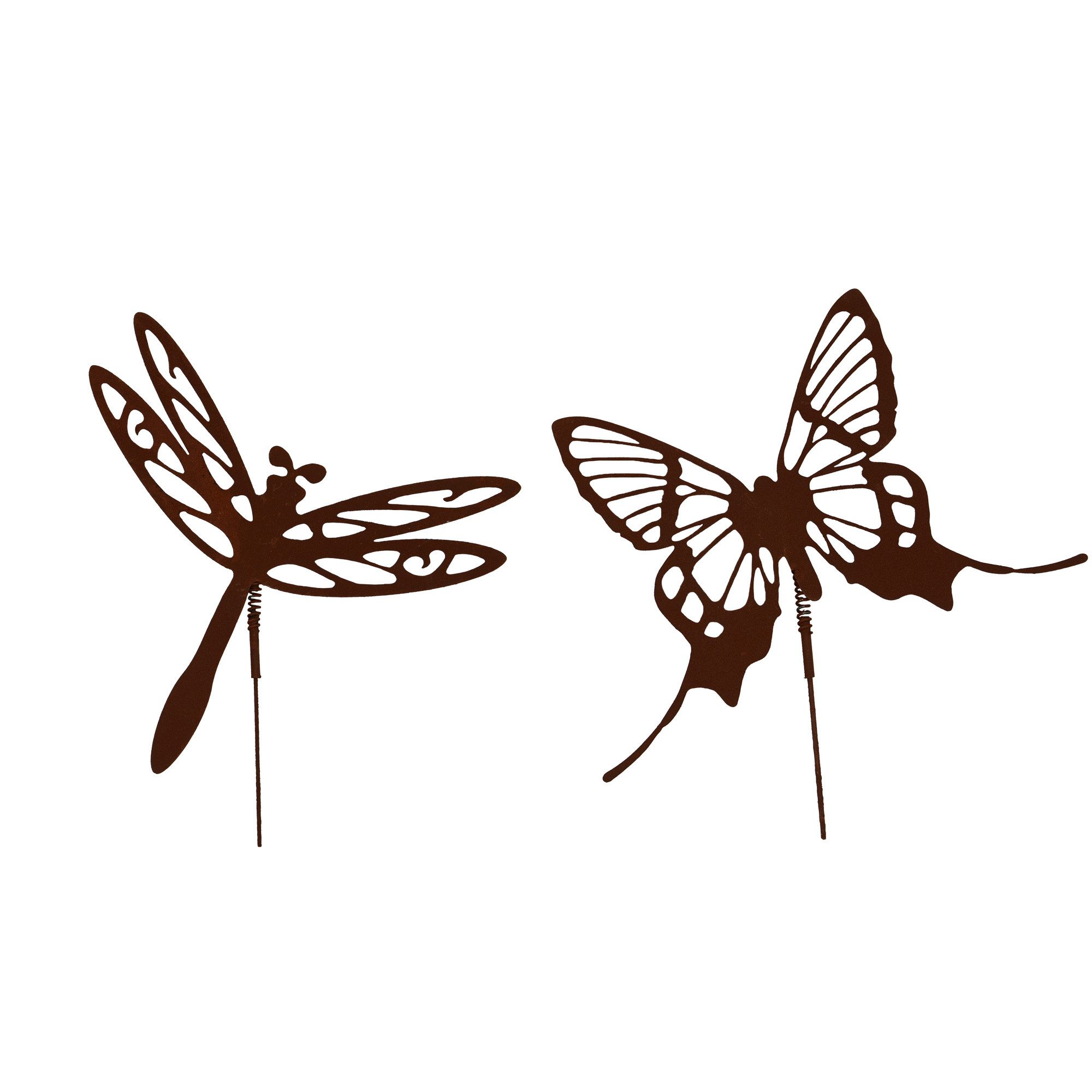 Der Schmetterling und die Libelle wurden aus robustem Metall in Rostoptik gefertigt und können sowohl drinnen als auch draußen dekoriert werden.