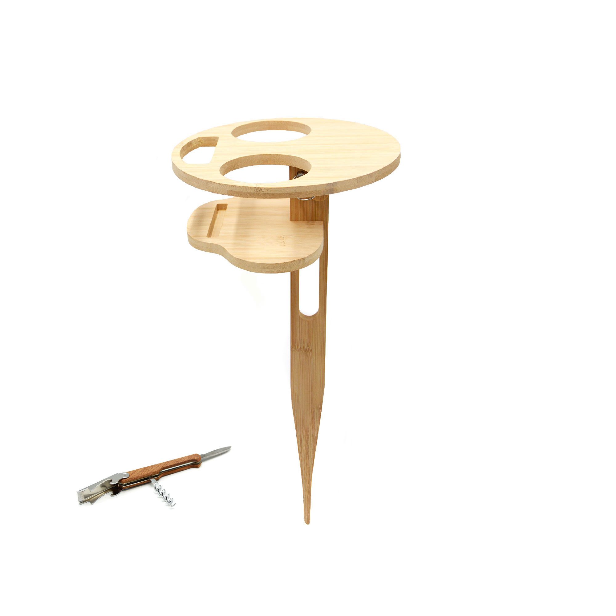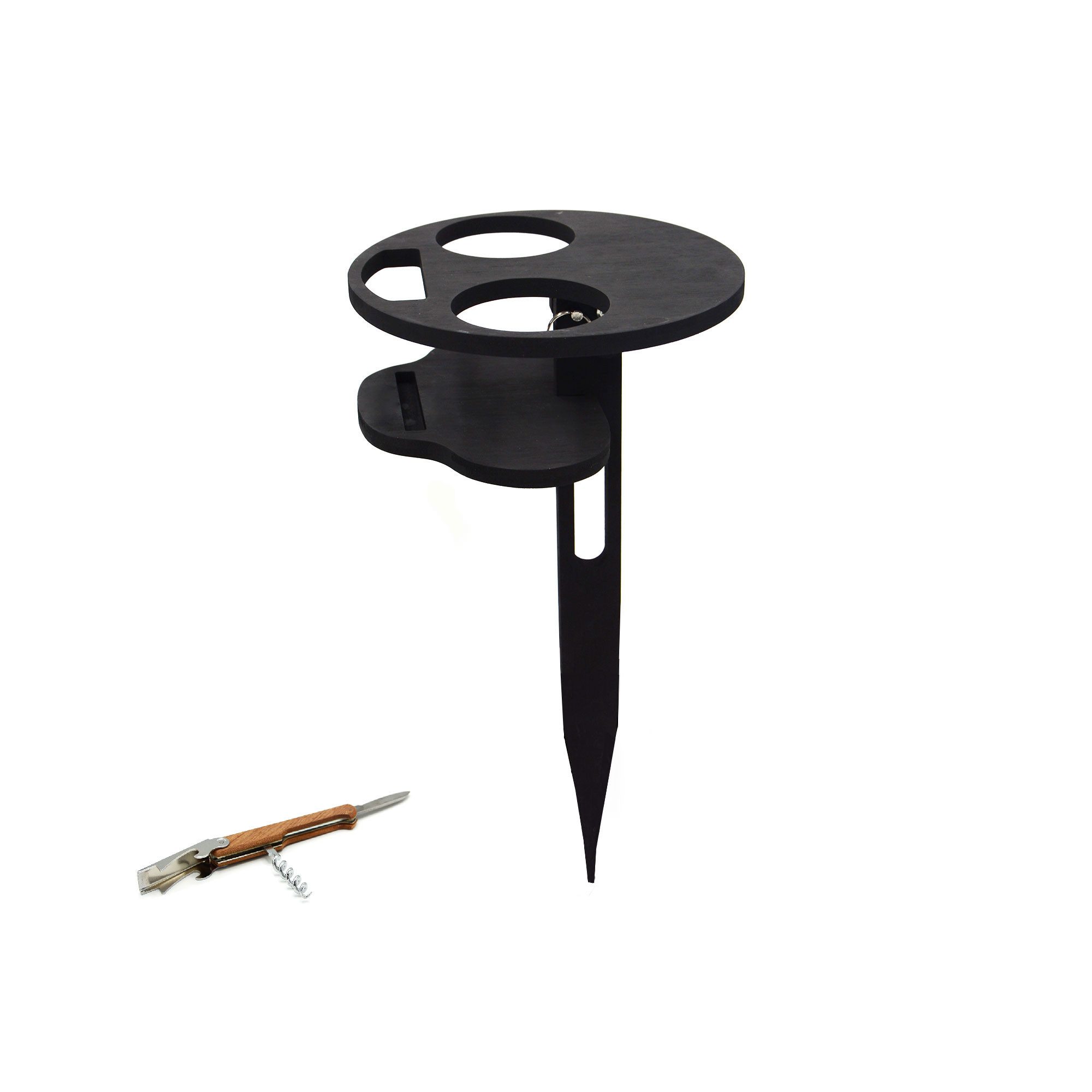 Der tragbare Biertisch bietet Platz für zwei Flaschen Bier und ein Smartphone. Die Tischplatte ist klappbar und wird mit dem beiliegenden Splint fixiert. Zudem liegt ein Taschenmesser mit Korkenzieher, Flaschenöffner und Messer bei.