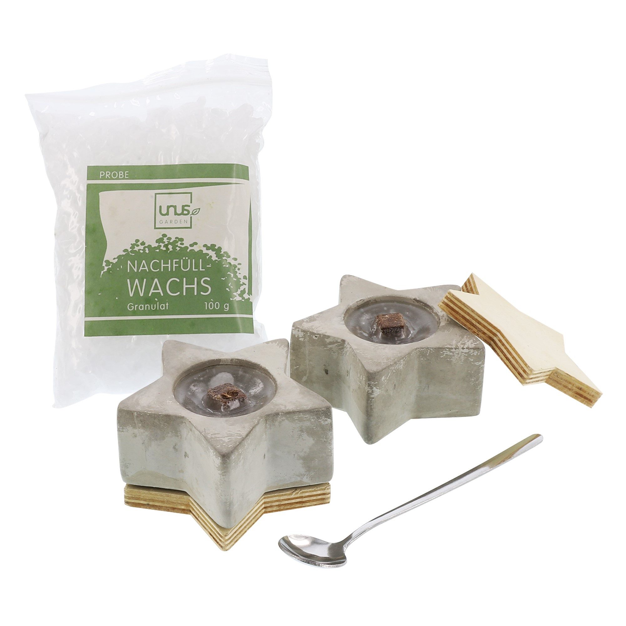 Unsere handgemachten Beton Feuersterne im robustem Betondesign schaffen eine unvergleichliche Atmosphäre im Freien und sind ein echter Hingucker. Im Set enthalten sind zwei sternförmige Kerzen aus Beton, 100g Nachfüll-Wachs in Granulatform, zwei sternförmige Löschbretter und ein praktischer, langer Löffel zum einfachen Nachfüllen des Wachses. Genießen Sie die unendliche Brenndauer, indem Sie den Docht immer wieder mit frischem Wachs versorgen. Die handgemachten Beton Feuerkerzen eignen sich perfekt als romantisches Tischfeuer oder Fackel im Außenbereich. Auf Campingplätzen, Stränden oder anderen Orten, an denen offene Feuer untersagt sind, schafft es eine gemütliche Lagerfeueratmosphäre. Anders als herkömmliche Kerzen oder Gartenfackeln trotzt unsere "Ewige Flamme" auch extremen Wetterbedingungen. Der Docht bleibt konstant in der Größe, und die Flamme brennt stabil und sicher und sorgt für eine kontinuierliche Flamme. Dank der Möglichkeit, Nachfüll-Wachs separat nachzukaufen, haben Sie immer genug Vorrat für gemütliche Stunden im Freien.