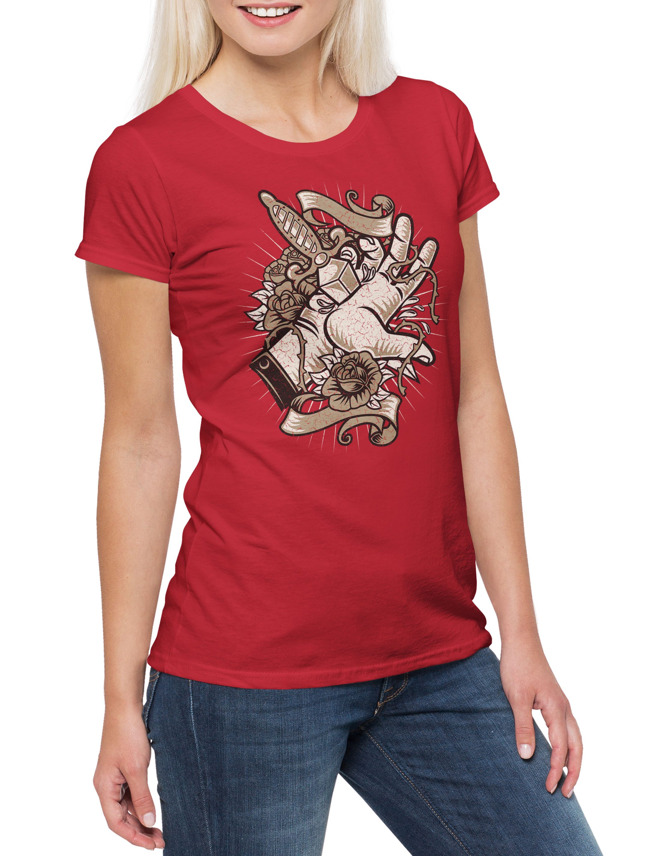 Tattoos und Rock & Roll liegen Dir am Herzen? Dann wird unser Daggered Hand Damen T-Shirt sicherlich eines deiner neuen Lieblingsstücke! Das ideale Geschenk für Geburtstage, Weihnachten, Ostern, Vatertag und Muttertag oder einfach als Aufmerksamkeit für einen guten Freund/Freundin, Kollegen/Kollegin!