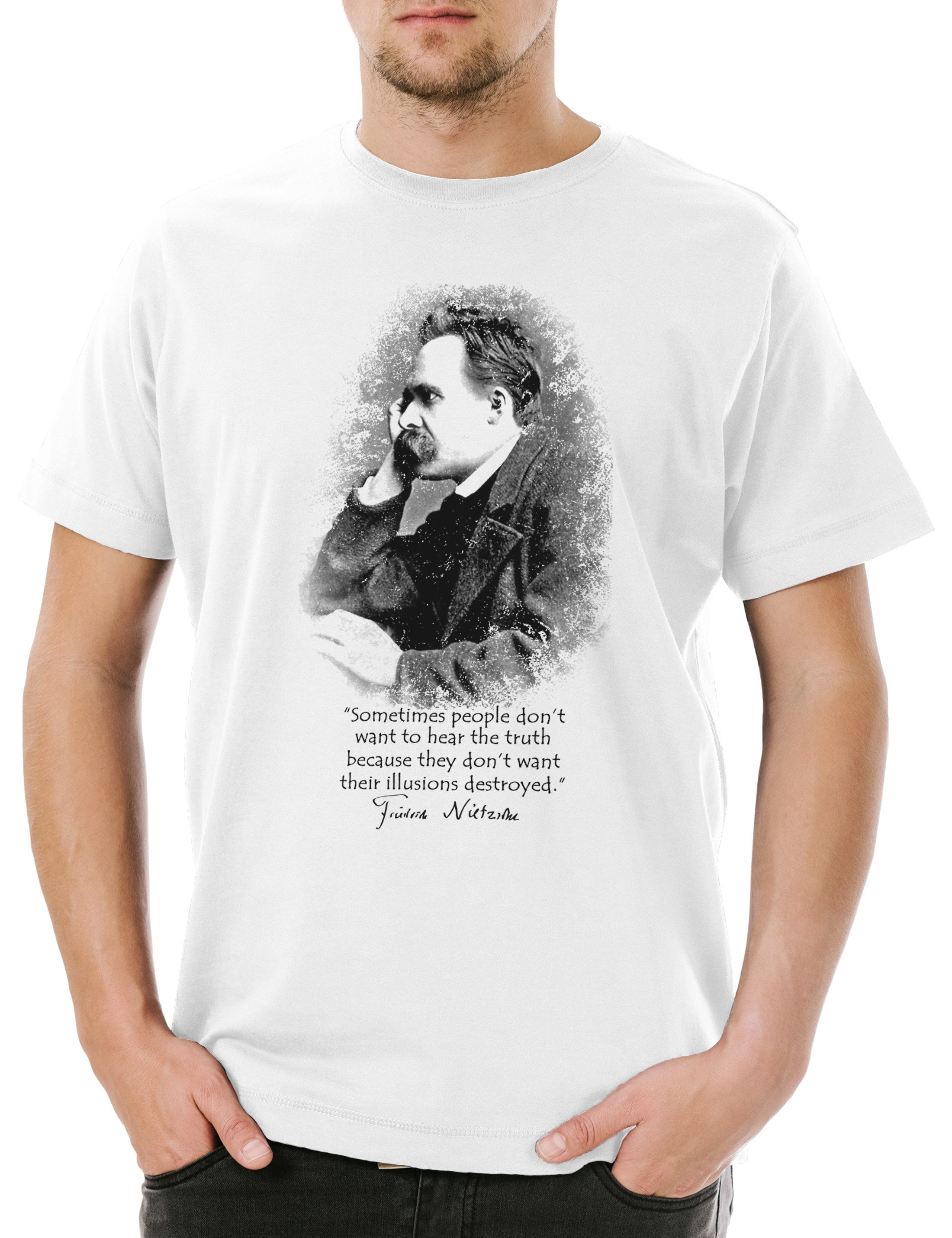 Entdecke unser Friedrich Nietzsche Illusions Herren T-Shirt und zeige Der Welt was Dich wirklich beschäftigt! Das ideale Geschenk für Geburtstage, Weihnachten, Ostern, Vatertag und Muttertag oder einfach als Aufmerksamkeit für einen guten Freund/Freundin, Kollegen/Kollegin!