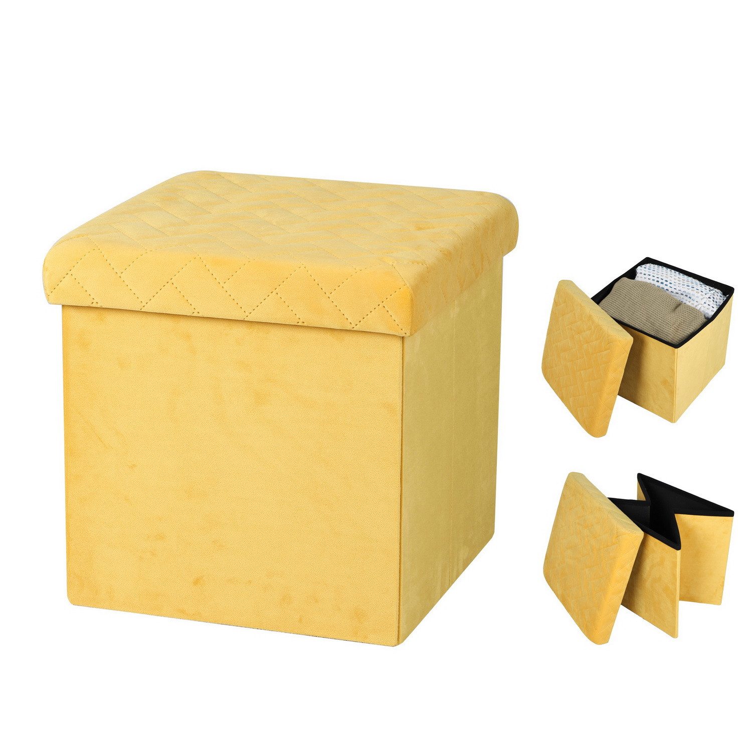 - vielseitig einsetzbarer Sitz- und Aufbewahrungs-Würfel - verwendbar als Sitzhocker, Fußbank, Aufbewahrungsfach, Nachttisch u.m. - gepolsterte Sitzfläche für bequemen Sitz - Maße aufgebaut: 38 x 38 x 38 cm - zusammenklappbar und platzsparend zu verstauen - Maße zusammengeklappt: 38 x 38 x 6 cm - Material: robustes MDF, Bezug: Polyester - schön designt in Samtoptik - abnehmbare Sitzfläche - Box bietet viel Stauraum (ca. 40 Liter) - maximale Belastbarkeit: 120 Kg