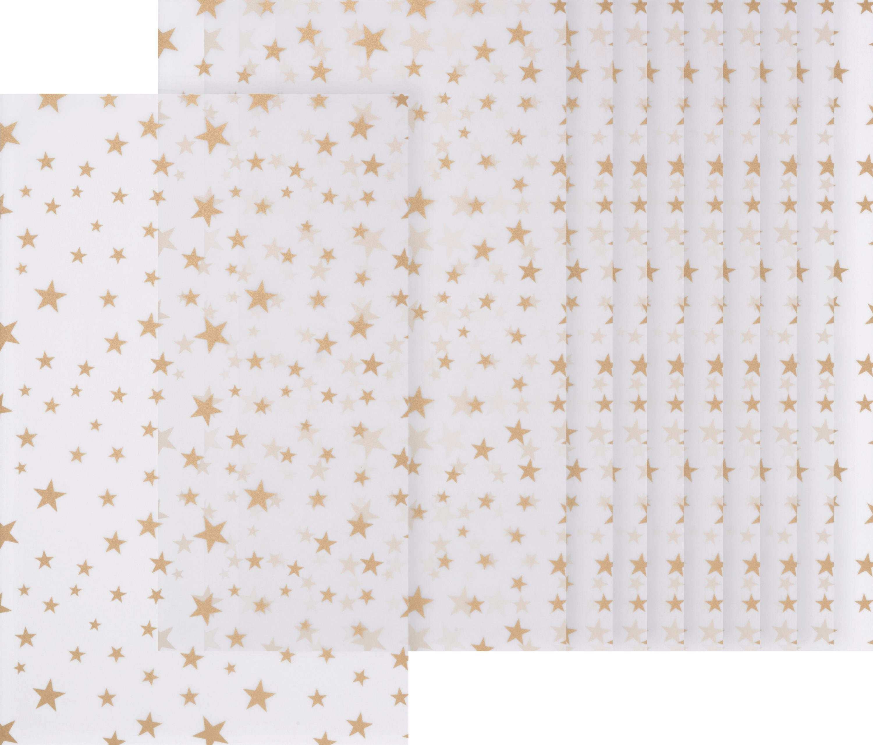 Die 10 Blatt Transparentpapier 'Sternchen' mit einer Размер von 33 x 20,5 cm sind einseitig bedruckt und haben jeweils ein Gewicht von 115 g/m². Das besondere Design mit Sternchenmotiven sorgt für eine zauberhafte Atmosphäre. Verpacke deine Geschenke oder gestalte individuelle Deko für Weihnachten. Das Transparentpapier eignet sich perfekt für kleine Geschenke oder als Einlage in Geschenktüten. Gestalte einzigartige Weihnachtsgeschenke mit unserem Transparentpapier 'Sternchen'.