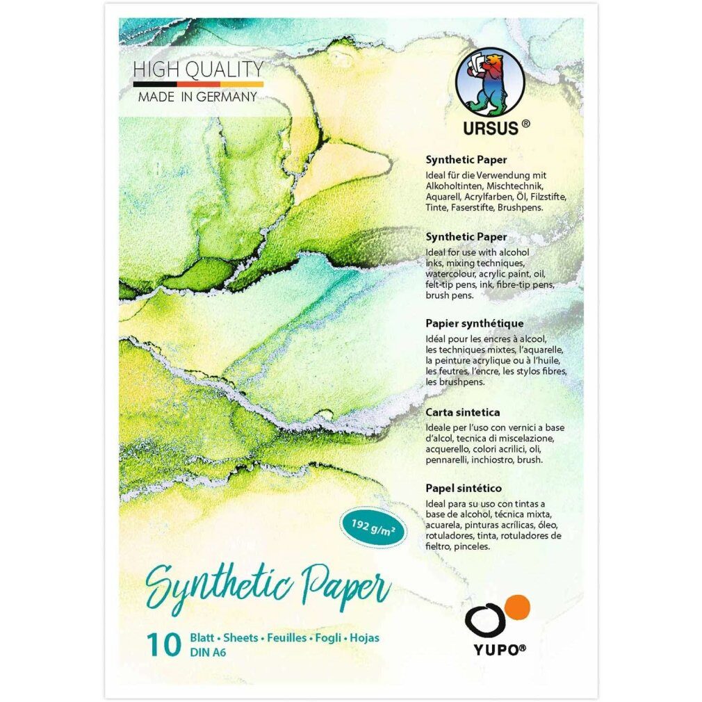 Yupo Synthetic Paper ist ein zu 100 % recycelbares, wiederverwertbares und wasserfestes Papier. Es ist sehr abriebfest, UV-beständig und hat eine glatte Oberfläche. Dieses synthetische Papier ist ideal für die Verwendung mit Alkoholtinten, Mischtechniken, Wasserfarben, Acrylfarben, Ölfarben, Filzstiften, Tinten- und Faserstiften. Verschiedene Mal- und Zeichentechniken erzeugen einzigartige Farbabstufungen ohne Wellen auf der Lackoberfläche. Yupo-Papier ist perfekt für Künstler und Hobbymaler. Mit diesem Block erhalten Sie 10 Blatt DIN A6-Papier mit einer Papierstärke von 192 g/m². Warnungen sind keine Sicherheitswarnungen