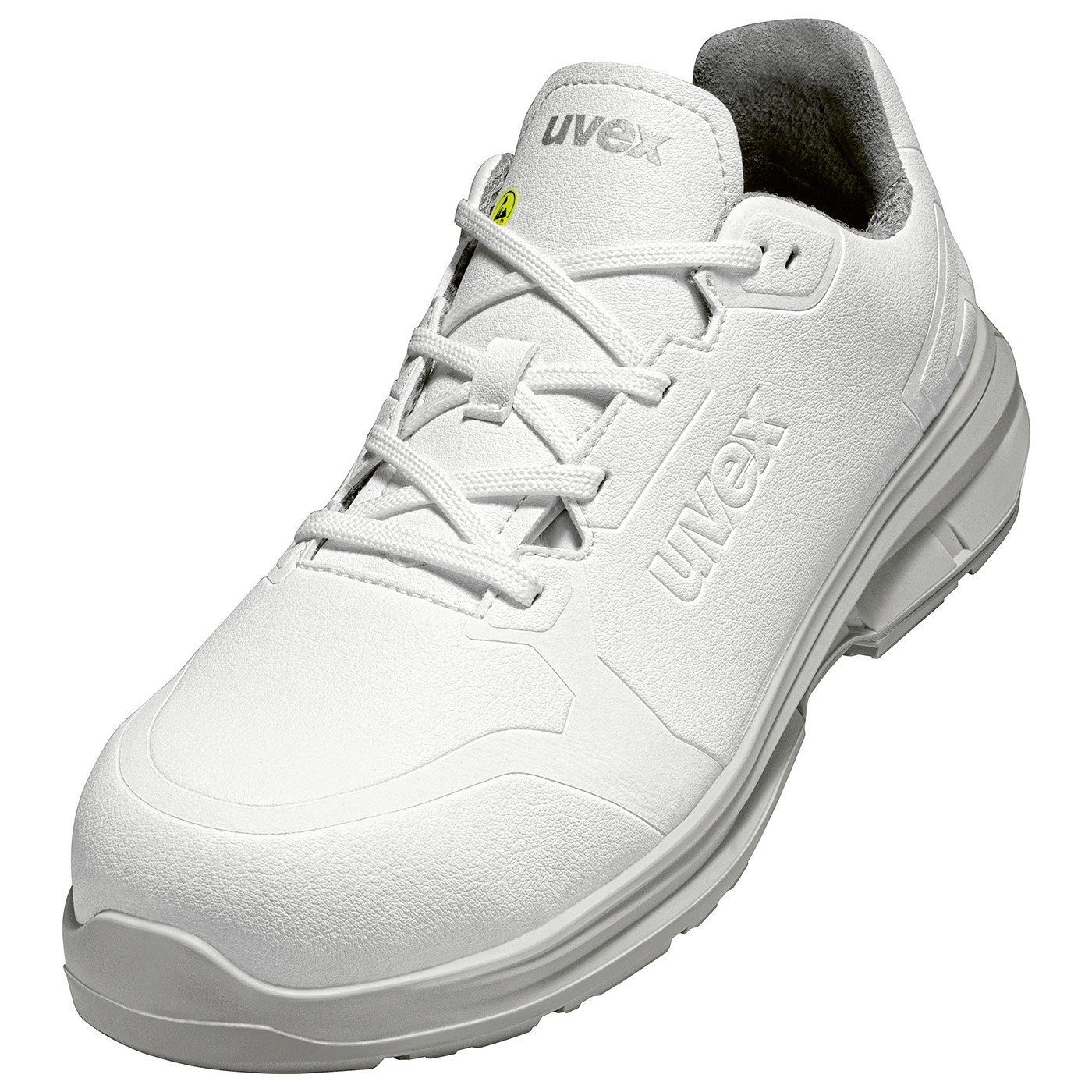 Schutzmerkmale: - erfüllt die ESD-Vorgabe mit Ableitwiderstand kleiner 35 Megaohm - 100 % metallfreie uvex xenova® Zehenschutzkappe – kompakt, anatomisch geformt, mit guter Seitenstabilität und thermisch nichtleitend - ergonomisch gestaltete Laufsohle aus Zweidichten-Polyurethan mit hervorragender Dämpfung und sehr guter Rutschhemmung - nichtmetallische, durchtritthemmende Einlage nach neuesten Normvorgaben, beeinträchtigt nicht die Flexibilität des Schuhs - zertifiziert gemäß DGUV 112-191
