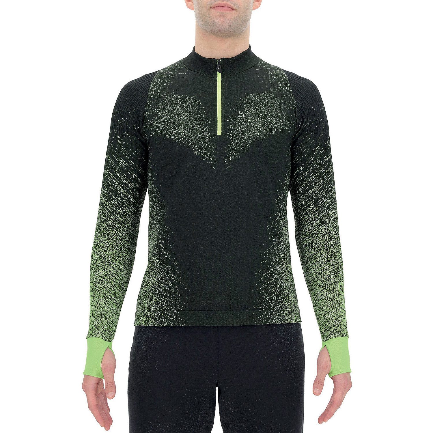 Das Exceleration Longsleeve Zip Shirt von UYN hat eine reguläre Passform, die sich um den Körper schmiegt, ohne sich einschränkend anzufühlen. Die Version mit halbem Reißverschluss ist so konzipiert, dass sie in Kombination mit technischer Unterwäsche oder einer Laufjacke getragen werden kann, wenn das Wetter unsicher ist.