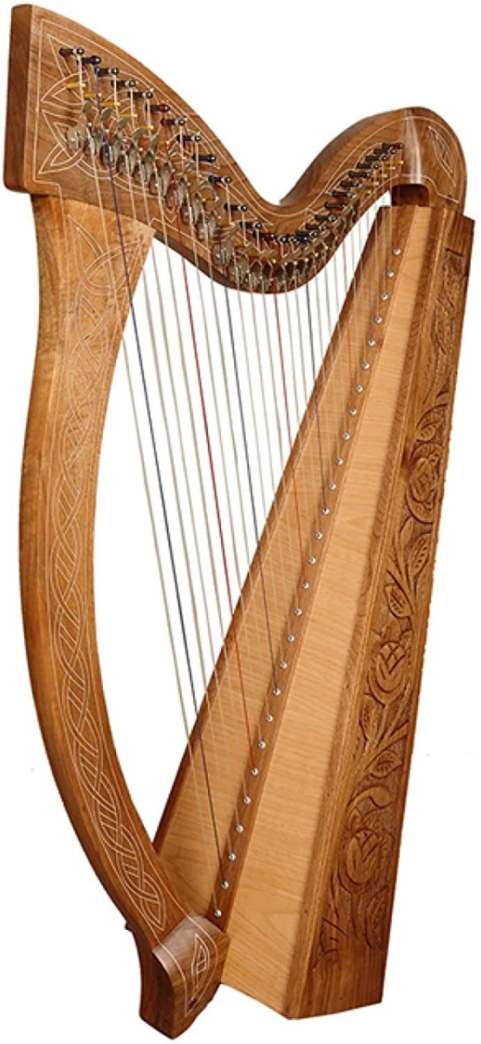 KELTISCHE HARFE mit 27-saiten , davon 22-Saiten mit Halbtonklappen. Das Instrument ist 88cm in der Höhe und 54cm in der Breite. Buegel und Corpus aus Roosewood Holz. Der Klangkörper hat 4 Schallöffnungen und ein Grundmaß; von 14 x 24 cm. Der Schallkörper wird von sehr schönen Schnitzereien verziert. Die Harfe kann so schnell in verschiedene Tonarten umgestimmt werden. Harfe inkl. 1 Stimmschlüssel + 1 Satz Ersatzsaiten Tonraum: C-C3. Exquisite handgefertigte Harfe Die 27-saitige Harfe verfügt über 4 Resonanzboxen, mit denen der Klang der Aufführung breiter und heller verbreitet werden kann. Uzman hat eine ausgezeichnete Härte und Stabilität. Es wird nicht leicht knacken, wenn sich das Klima ändert, so dass diese irische Harfe als Sammlerstück verwendet werden kann, wenn sie nicht spielt. 27 Saitenharfe Die einzigartige Säulenstruktur der Harfe ermöglicht es, beim Zupfen einer Saite einen kontinuierlichen Klang zu erzeugen, der im Raum wirbelt. Jede Saite der Leierharfe ist um die entsprechende Metallklangsäule gewickelt. Die Lautstärke ist recht flexibel und der Ton lässt sich leicht einstellen.