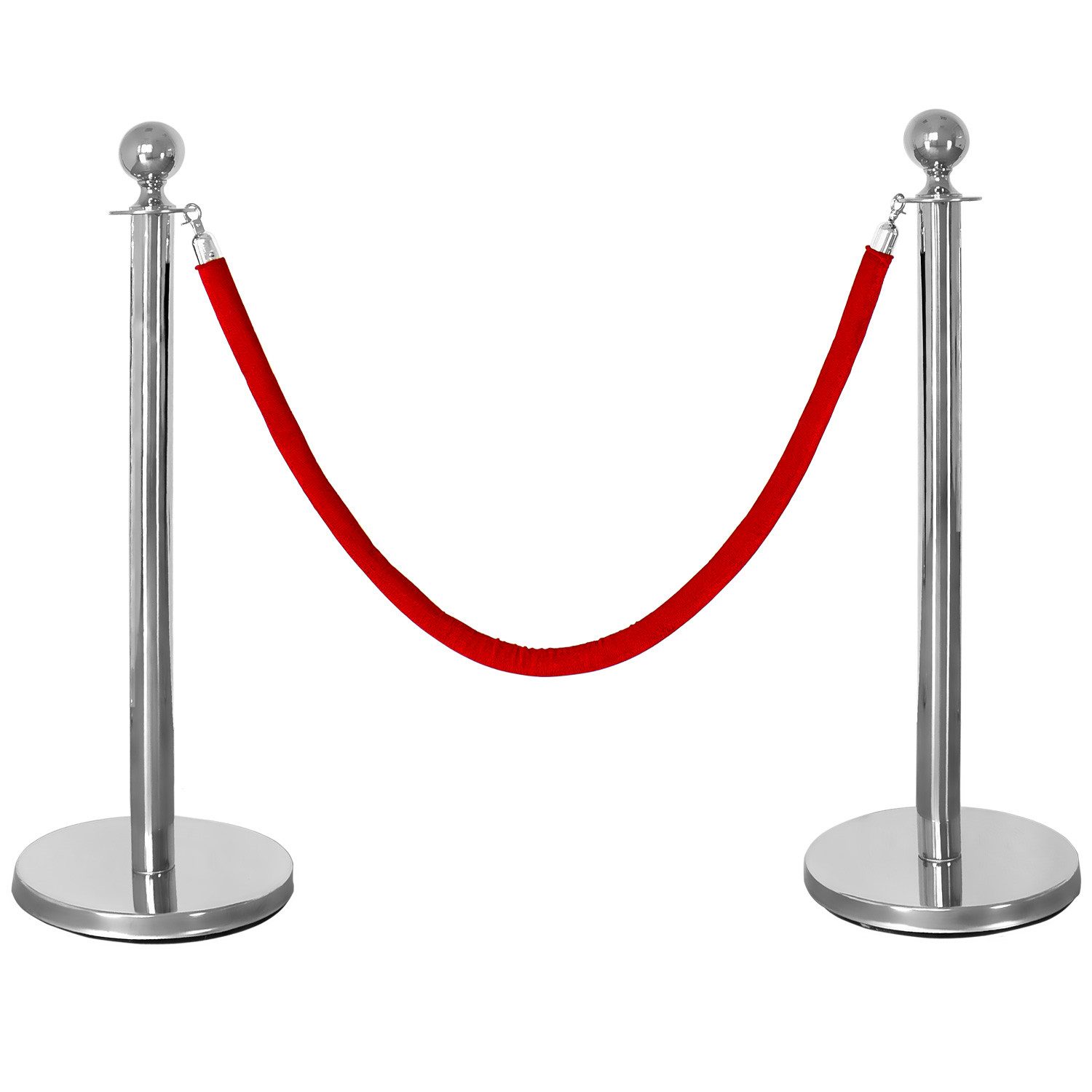 Jeder Fuß des Ständers enthält eine spezielle Scheibe, die aus einer Beton-Gummi-Mischung gefertigt ist. Diese Kombination sorgt nicht nur für einen sicheren Stand, sondern schont auch den Boden. Die Kordeln sind mit weichem, rotem Samt bezogen, was dem System eine luxuriöse Optik verleiht.