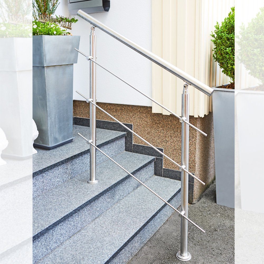 Treppengeländer für den Außenbereich aus Edelstahl, 105 cm hoch und wahlweise 80 cm / 100 cm / 120 cm / 140 cm / 150 cm / 160 cm / 180 cm oder 200 cm lang, wahlweise mit 2, 3, 4 oder 5 Streben, oder ohne Streben, inkl. Montagematerial