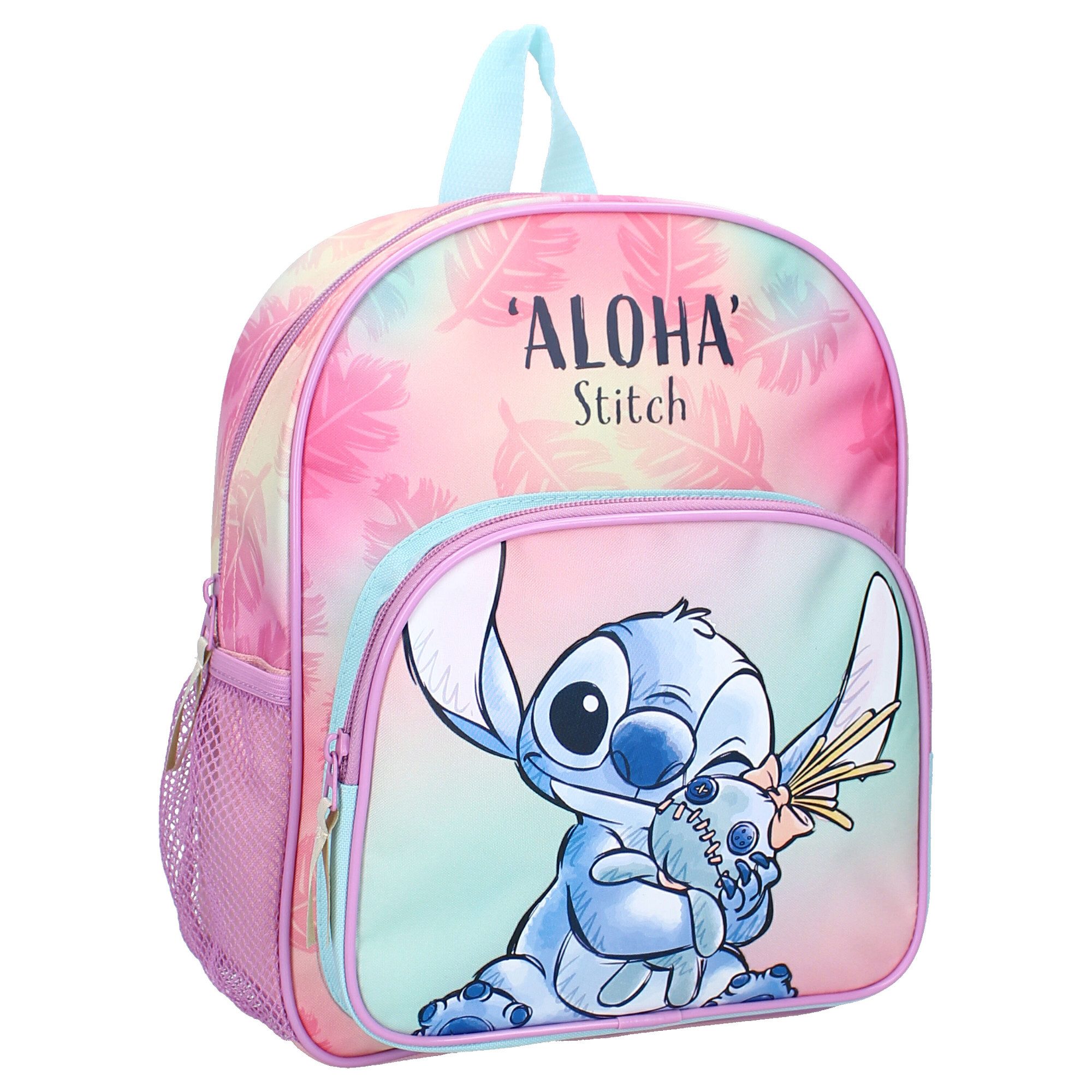 Stylischer Stitch-Rucksack im rosa Galaxy-Design mit Aloha-Motiv. Zwei Fächer mit Reißverschluss, verstellbare Träger – ideal für Schule, Ausflüge & kleine Abenteuer.
