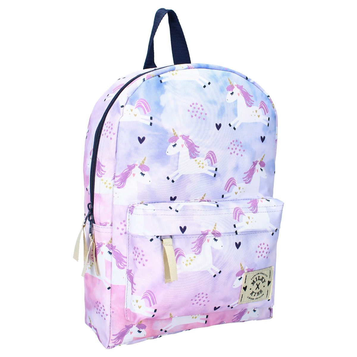 Tauche ein in die magische Welt von Milky Kiss mit dem Rucksack „Follow The Rainbow“! Mit Ombré-Farbverlauf in Rosa, Lila und Hellblau, glitzernden Reißverschlüssen und niedlichen Einhörnern ist dieser Rucksack ein echter Hingucker. Ideal für Schule, Ausflüge oder Freizeitspaß!