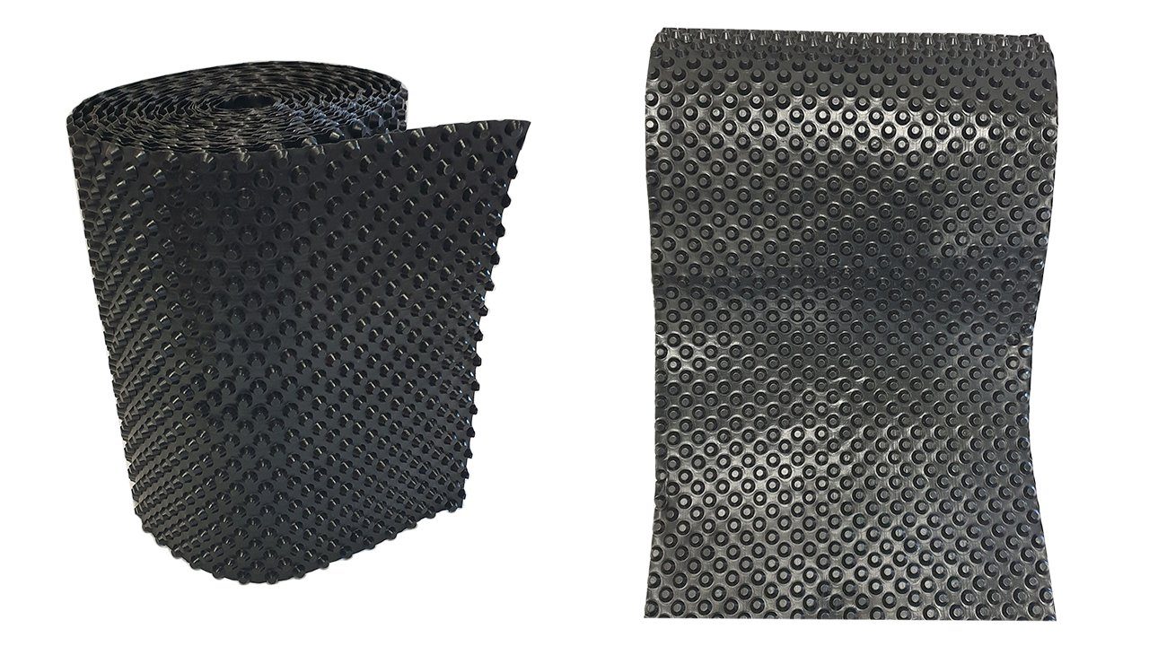 Die Noppenbahn ist aus verdichtetem Polyethylen mit hohem Abdichtungsvermögen (HDPE). Die Noppenfolie bildet zusätzliche thermische Isolierung der Mauer und Fundamente.