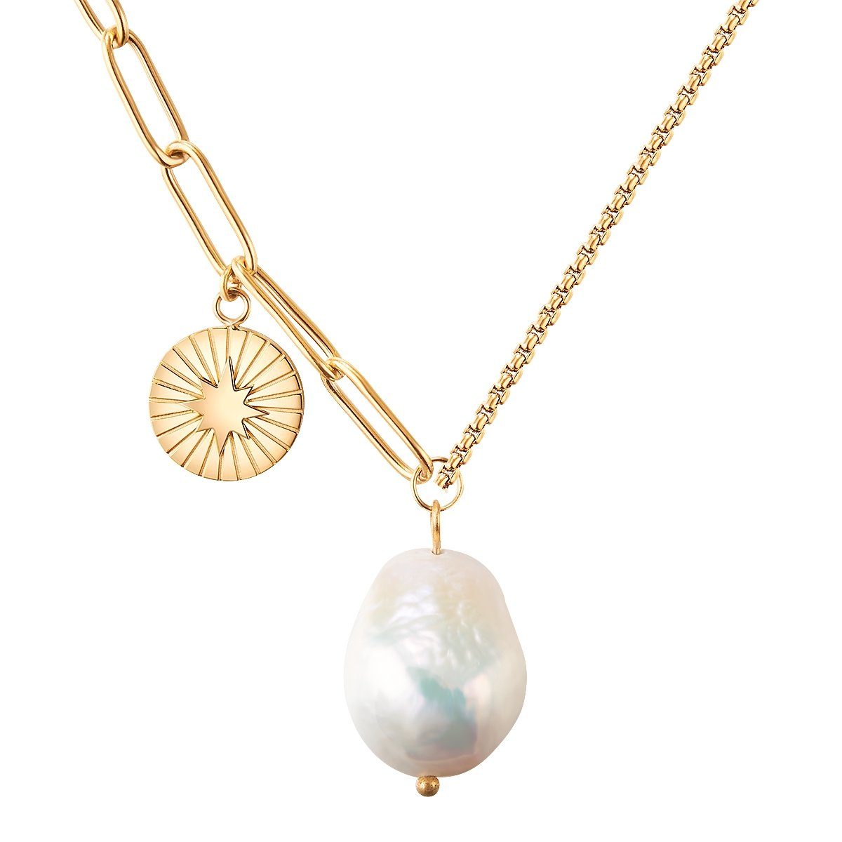 Sie lieben den geheimnisvollen Schimmer von Perlen in Verbindung mit einem trendigen Schmuckdesign? Dann werden Sie diese hübsche Kette des Labels Valero Pearls nicht mehr ablegen wollen! Eyecatcher ist die Längsteilung der Kette in eine filigrane Kastenkette und eine lässige Gliederkette. Der Anhänger aus einer barocken Süßwasser-Zuchtperle am Verbindungspunkt der beiden Kettenhälften betont das extravagante Gestaltungskonzept und ein Mini-Medaillon mit Sterngravur setzt einen asymmetrischen Akzent. Kette und Medaillon sind aus Edelstahl gefertigt und mit einer klassischen Gelbvergoldung veredelt. Ein praktischer Karabinerverschluss und ein Verlängerungskettchen ermöglichen die unkomplizierte Длинаnanpassung.