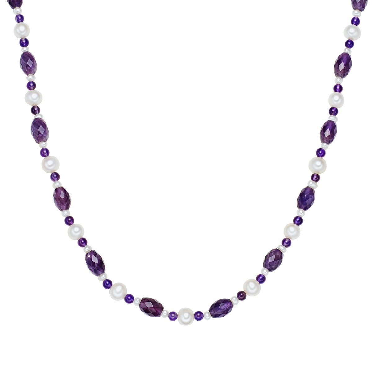 Aus Süßwasser-Zuchtperlen und facettierten Amethysten auf Perlseide