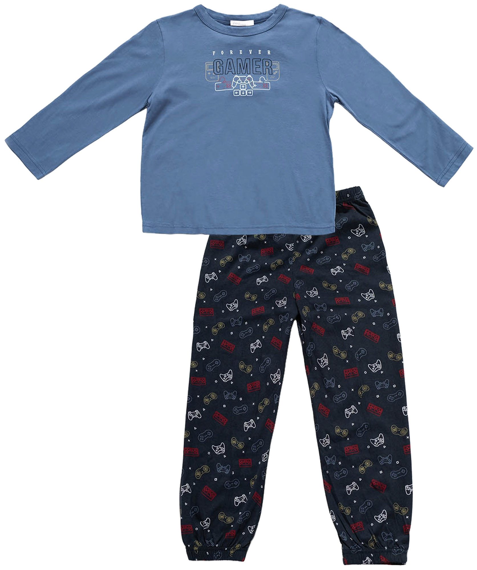 Das Oberteil des Schlafanzugs ist mit einem klassischen Rundhalsausschnitt gestaltet. Auf der Brust des Oberteils befindet sich ein niedlicher Gamer-Aufdruck. Die lange Hose des Schlafanzugs ist mit einem Alloverdruck versehen. Dieses Muster fügt dem Schlafanzug einen fröhlichen und niedlichen Touch hinzu und schafft eine bezaubernde Atmosphäre.