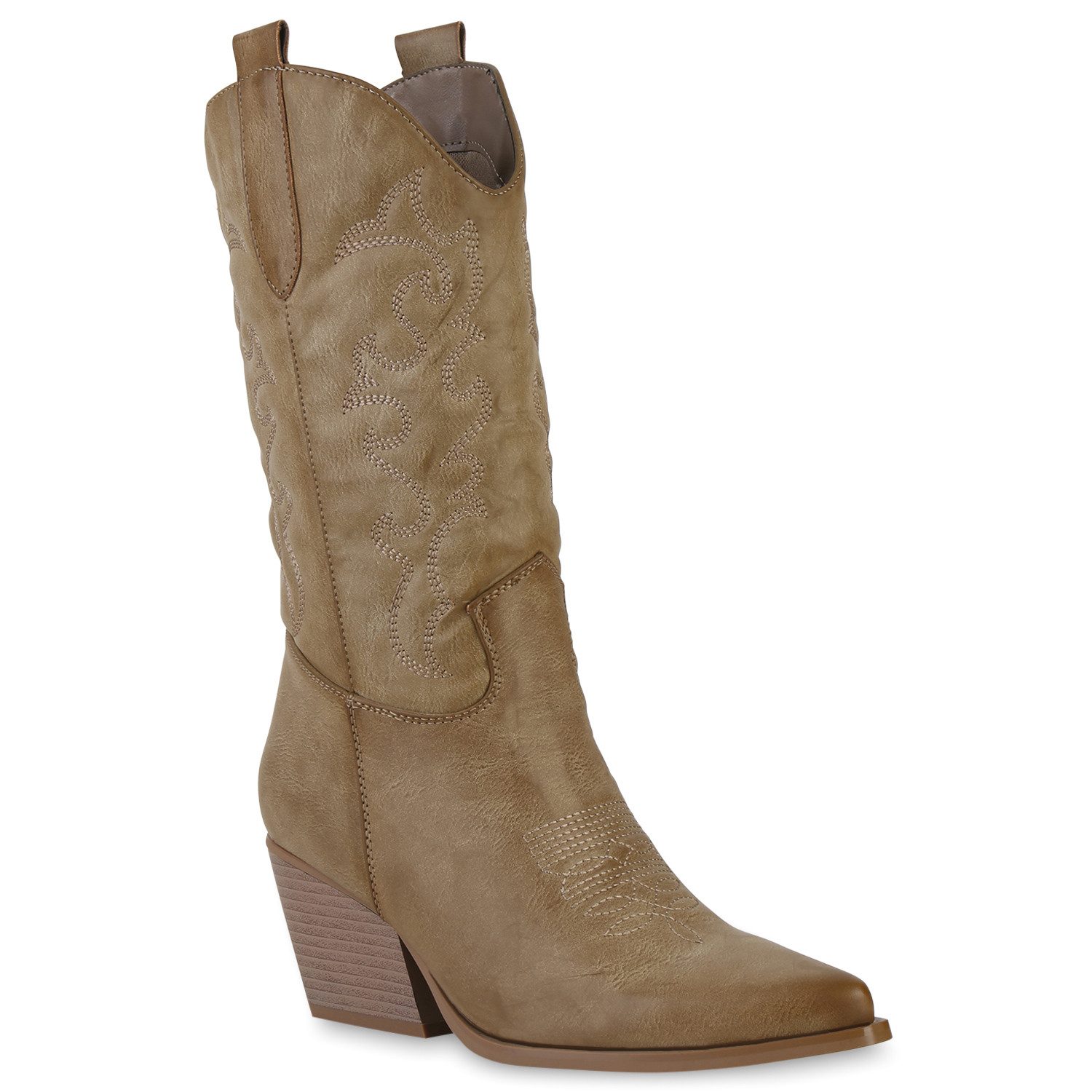 Besondere Merkmale | Damen Stiefel Cowboystiefel Stickereien Holzoptikabsatz |