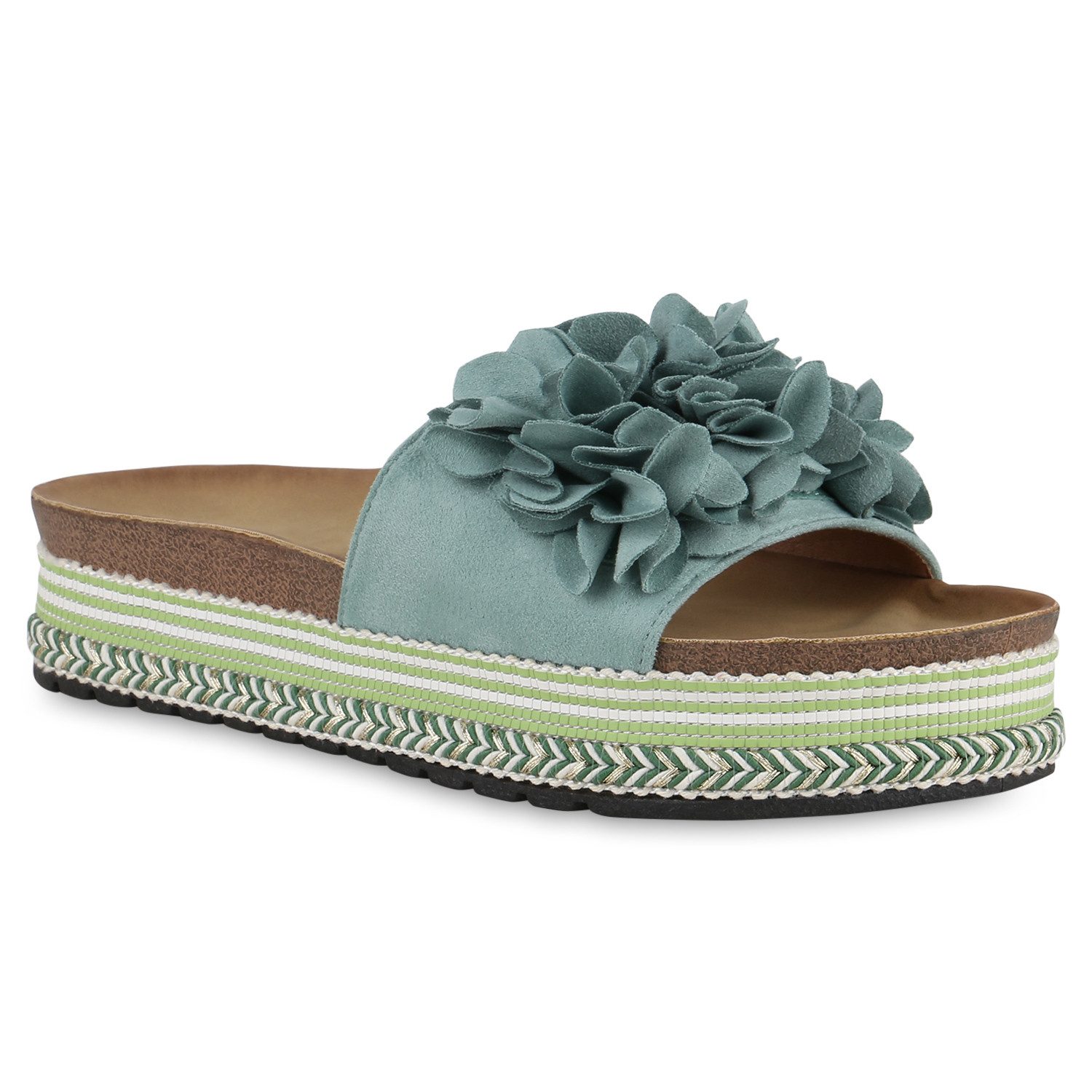 Besondere Merkmale | Damen Pantoletten Sandaletten Volants Profil-Sohle Plateau- |
