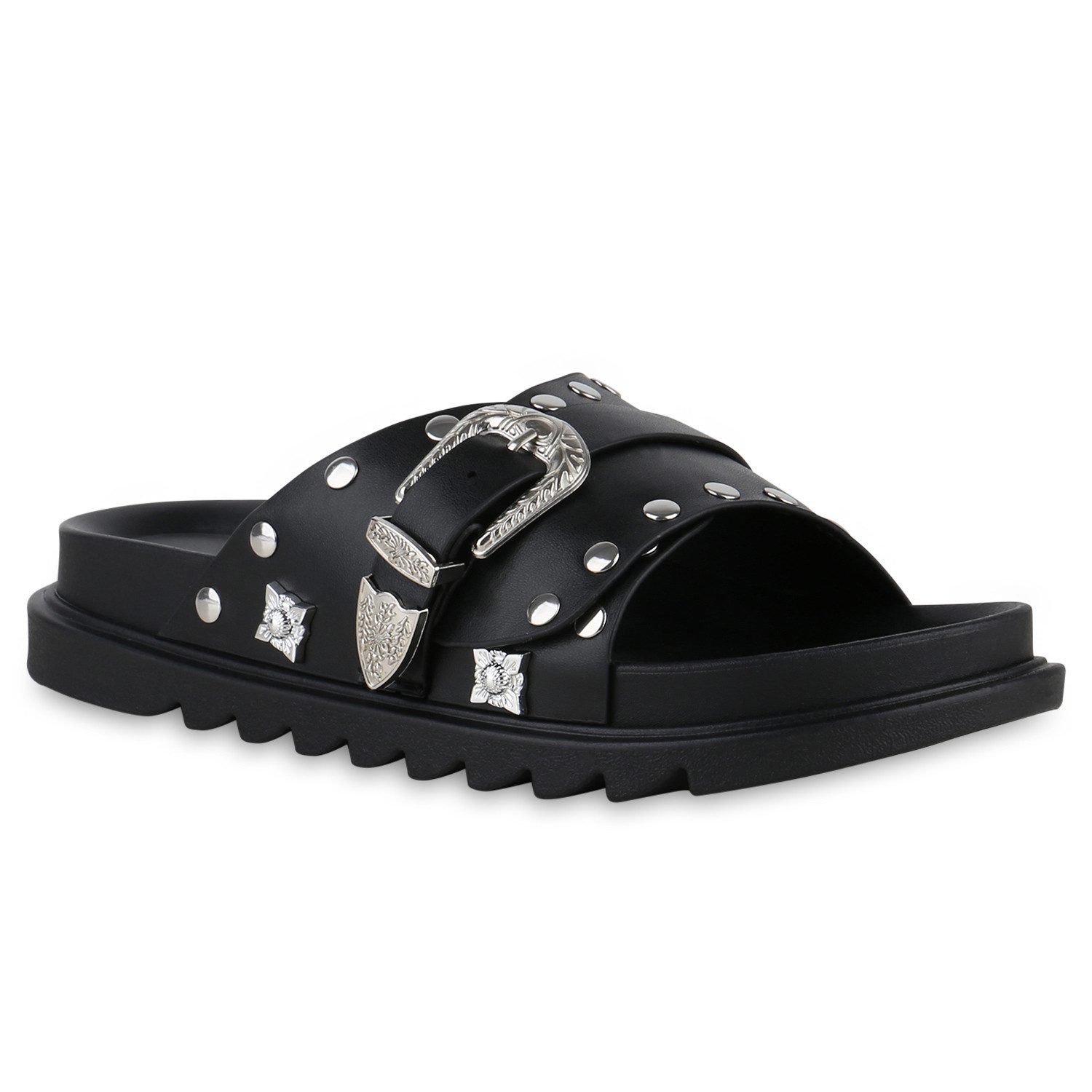 Besondere Merkmale | Damen Pantoletten Sandalen Nieten Schnallen Profil-Sohle |