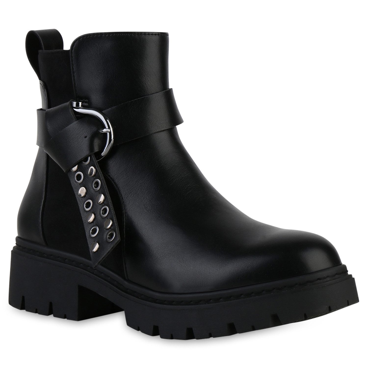 Besondere Merkmale | Damen Biker Boots Stiefeletten Schnallen Ösen Nieten |