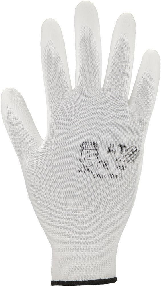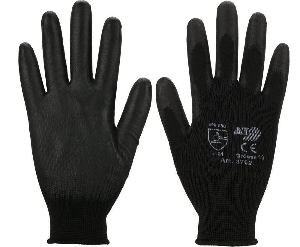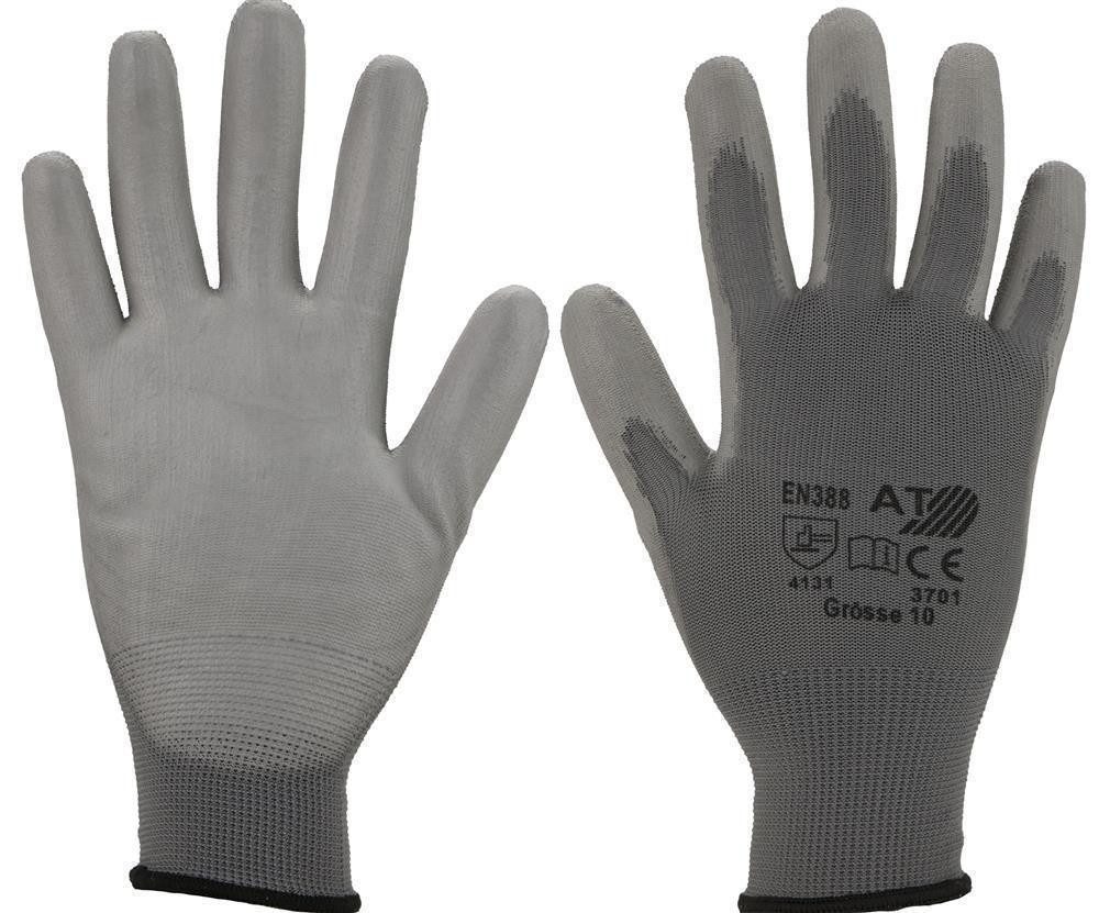 Montagehandschuhe aus 100% Polyamid (Nylon) mit einer PU (Polyurethan) Beschichtung an Innenhand und Fingerkuppen.