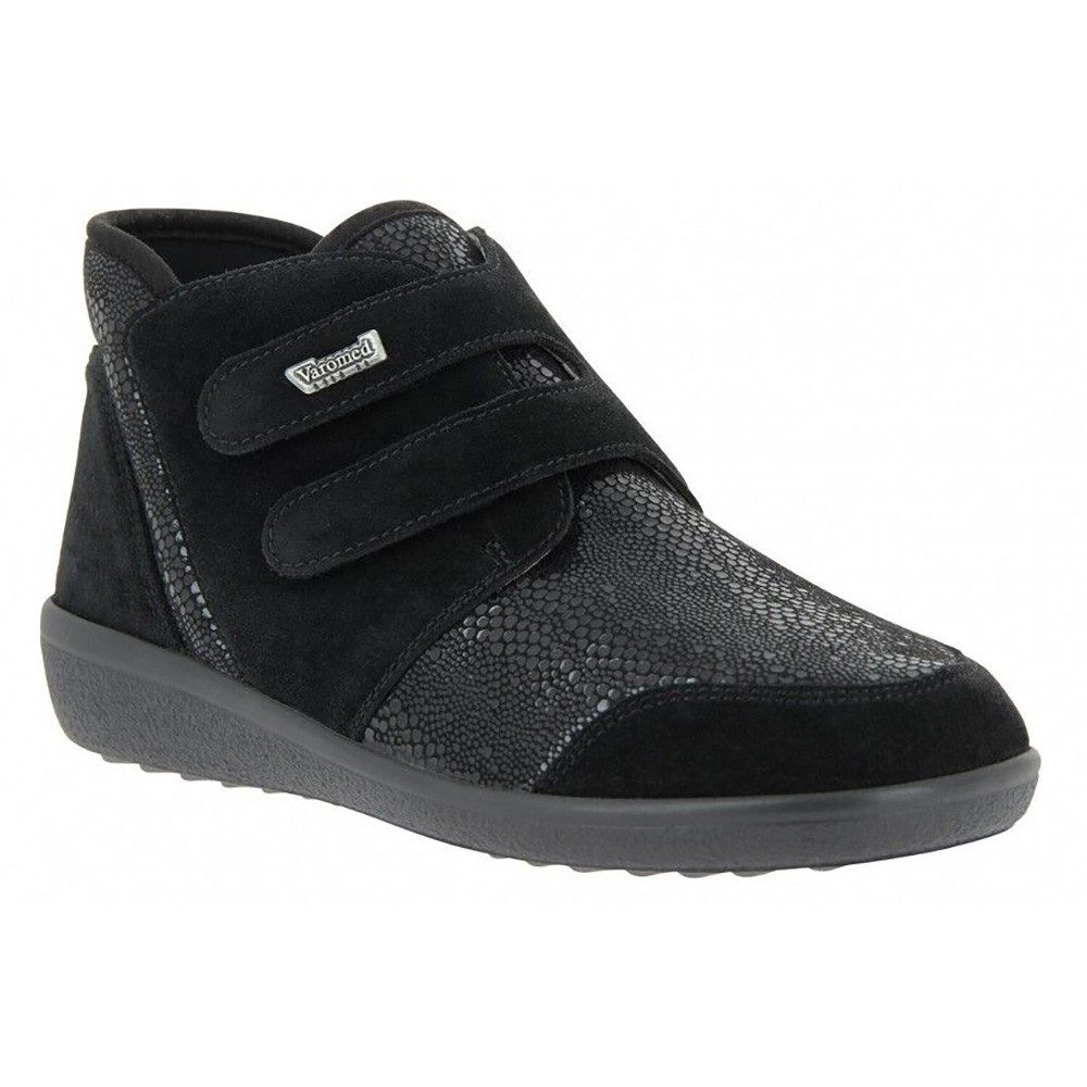 Die Varomed Prophylaxe Klett-Stiefelette für Damen in Schwarz, Размер 40 2/3, bietet nicht nur Stil, sondern auch Komfort und Funktionalität. Mit ihrem Dialinofutter sorgt sie für eine angenehme Wärme und ein ausgeglichenes Fußklima, während das Weichschaumfußbett mit Dialinobezug für optimalen Tragekomfort und Unterstützung sorgt. Die Klettverschlüsse ermöglichen ein einfaches An- und Ausziehen und gewährleisten gleichzeitig eine individuelle Anpassung. Die PU/TPU-Sohle bietet eine solide und rutschfeste Basis, während die flache Absatzform Stabilität und Bequemlichkeit beim Gehen gewährleistet. Insgesamt vereint diese Stiefelette Funktionalität und Ästhetik für Damen, die sowohl auf ihre Gesundheit als auch auf ihr äußeres Erscheinungsbild achten möchten.