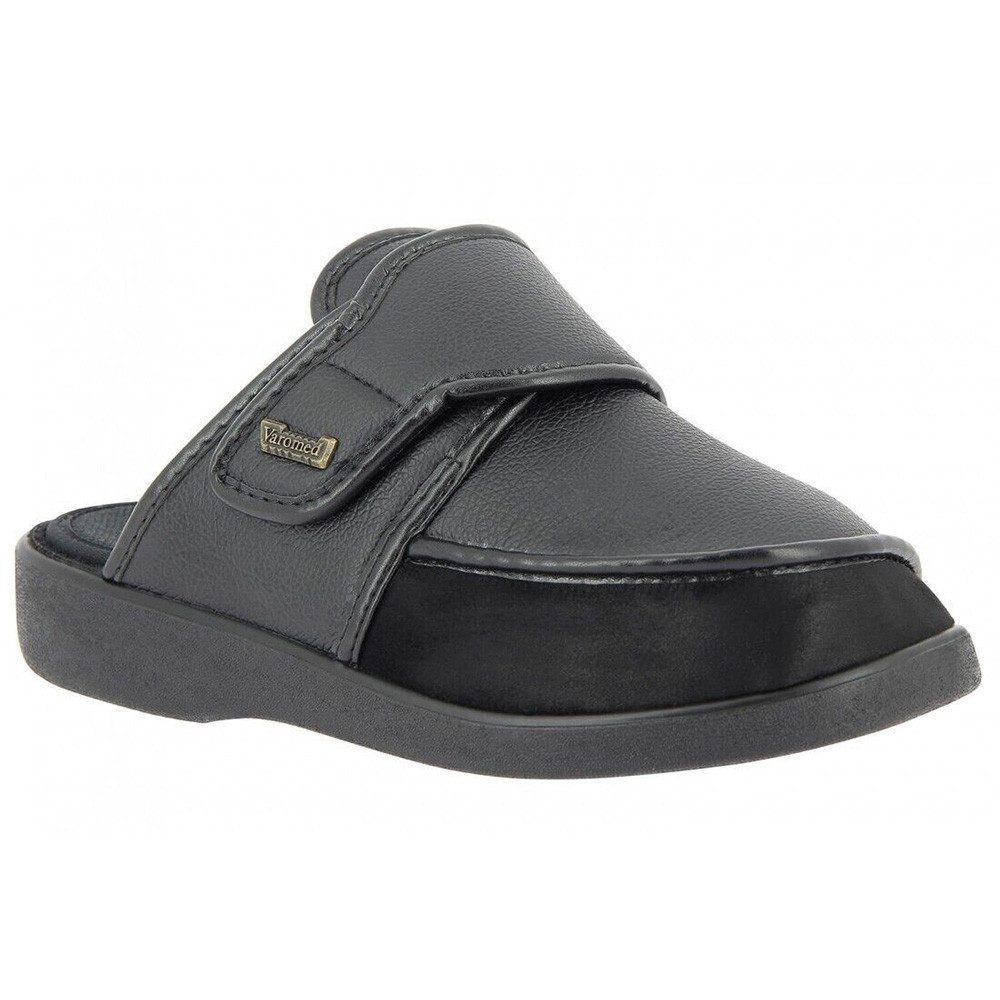 Die Verbandschuhe Unisex Varomed Kunstleder Grenoble in Schwarz und Размер 36 bieten einen hohen Komfort und eine optimale Unterstützung für die Füße. Das Obermaterial besteht aus einem strapazierfähigen Lederimitat mit Stretch-Eigenschaften, was eine gute Passform gewährleistet. Der Stil der Schuhe ist als Clog gestaltet, was sie einfach an- und ausziehbar macht. Sie gehören zur Produktart der Pantoletten und verfügen über einen Klettverschluss als Verschlussmechanismus für eine individuelle Anpassung. Diese Verbandschuhe sind orthopädisch gestaltet und verfügen über ein Weichschaumfußbett mit Cool-Max, das für ein angenehmes Tragegefühl und eine gute Feuchtigkeitsregulierung sorgt. Das Futtermaterial besteht aus Frottee, das zusätzlichen Komfort bietet. Die Schuhweite ist mit L angegeben, was auf eine großzügige Passform hinweist. Die Farbe Schwarz verleiht den Schuhen ein zeitloses Aussehen. Die Absatzhöhe ist flach, was für eine bequeme Gehposition sorgt. Die Laufsohle besteht aus Polyurethan, was eine gute Dämpfung und Strapazierfähigkeit bietet. Die Schuhspitze ist geschlossen, was zusätzlichen Schutz und Stabilität bietet. Die Marke Varomed steht für Qualität und Komfort bei orthopädischen Schuhen.