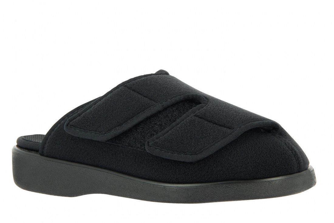 BITTE EINE NUMMER GRÖßER BESTELLEN! Therapieschuh Kopenhagen Weite L Sie benötigen ein Verbandpantoffel für leichtes Handling und Einsatz bei verbundenen oder geschwollenen Füßen? Dann sind Sie bei diesem Modell gut aufgehoben. Der Pantoffel ist vorne im Ristbereich zusätzlich mit zwei breiten Kletten einstellbar und lässt sich an die jeweilige Fußstärke optimal anpassen, gerade dann wenn der Fuß im Laufe des Tages anschwillt. Das antibakterielle Frotteefutter mit Silber-Ionen ist wirksam gegen Bakterien und Hautpilz, reduziert Schweißgeruch und wirkt infektionshemmend. Der Fersenbereich ist frei, kann aber durch einen zusätzlichen Fersenriemen als Sandale umfunktioniert werden. Da gerade ältere Menschen viel Sicherheit beim Gehen benötigen, empfehlen wir für mehr Halt unseren Fersenriemen Artikel 58901 zu bestellen. An heißen Tagen können die Füße stark schwitzen, die COOL MAX Einlage sorgt für angenehme Temperierung. Die Einlage kann auch durch persönliche orthopädische Einlagen ersetzt werden. Die Pantolette ist im Schonwaschgang bei 30° waschbar. Der Pantoffel hat die Weite L, und eignet sich für das Tragen von Verbänden, Wickelungen oder Schwellungen. Achtung, dieser Artikel fällt kleiner aus. Wir empfehlen Ihnen mindestens eine Nummer größer zu wählen.