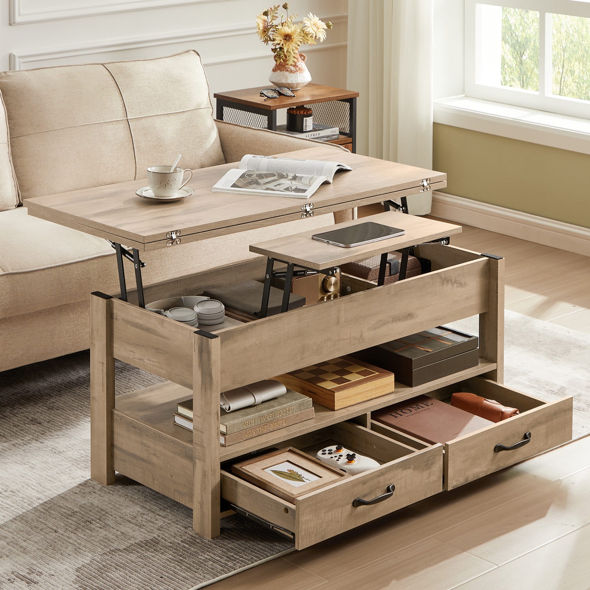 Eigenschaften | Doppel-Hebemechanismus Gaszylinder Schubladen und 3 Fächer unter der Tischplatte 1 offenes Fach höhenverstellbar Wohnzimmer Homeoffice ausklappbar multifunktional |