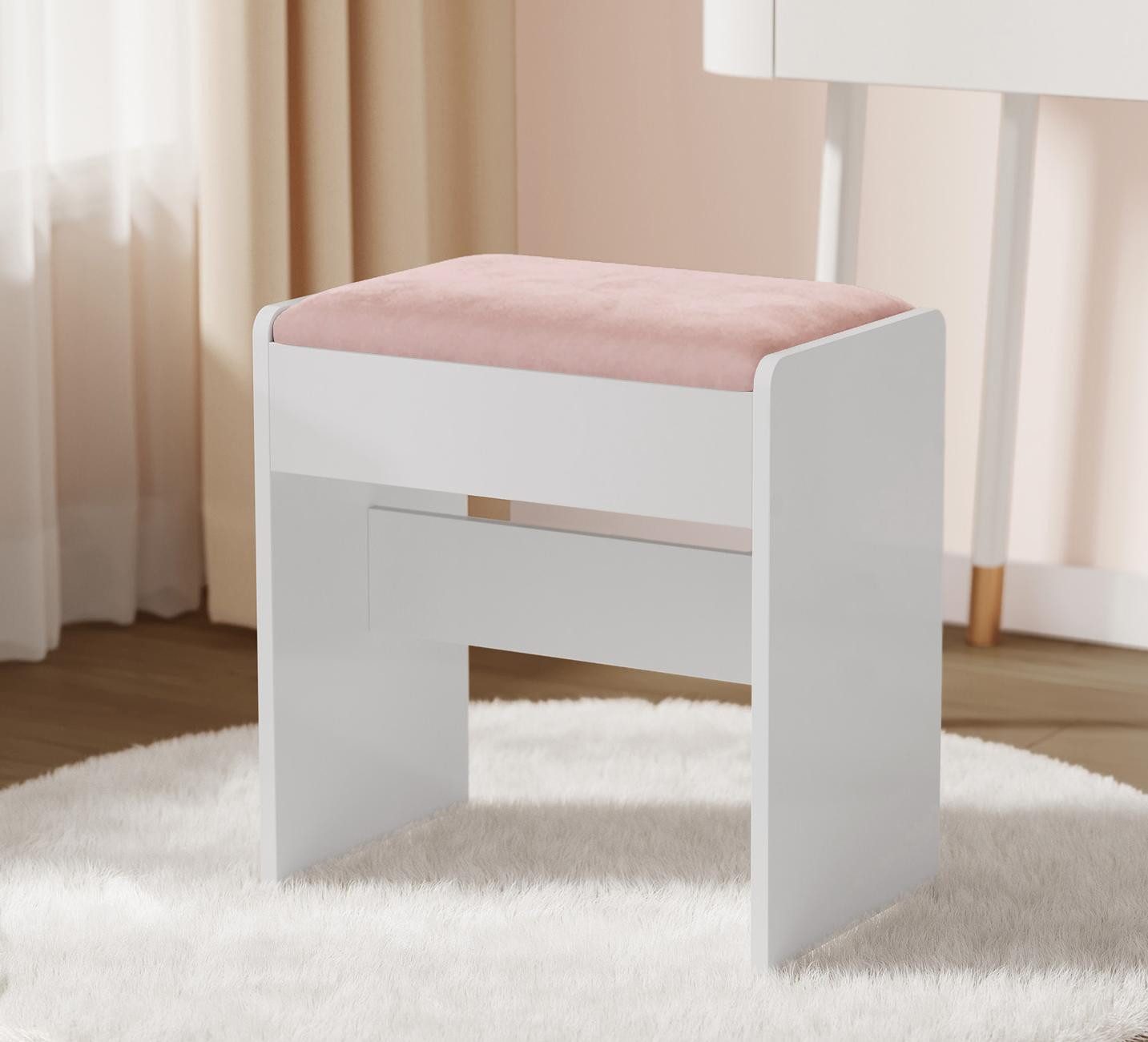 Hier findet alles seinen Platz.Dieser Kosmetiktisch Hocker aus hochwertigen Spanplatten ist stabil und langlebig; seine Beschichtung ist verschleißfest und leicht zu reinigen