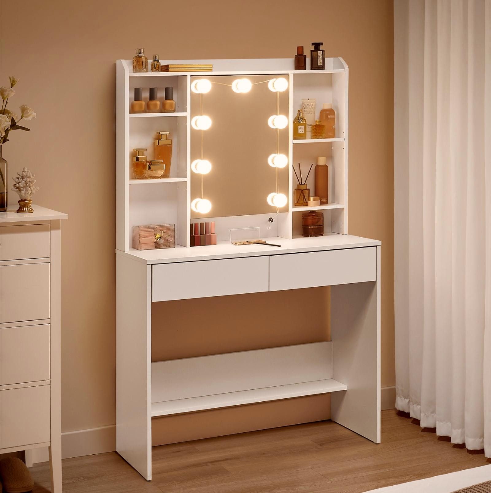 - Bitte befestigen Sie diese Schminkkommode mit dem beiliegenden Kippschutz an der Wand, um eine sichere Nutzungsumgebung zu schaffen.