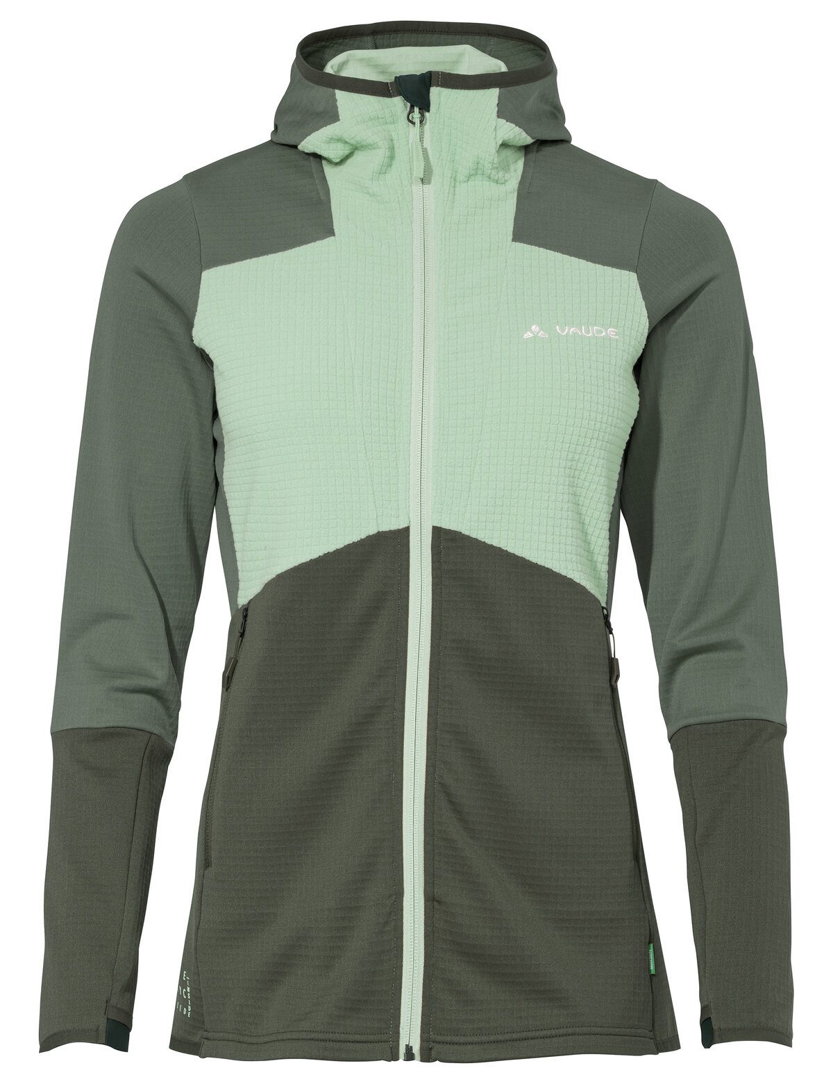 Ob solo oder im Zwiebelprinzip getragen - bei Ski- und Bergtouren gehört die Fleecejacke für Damen definitiv zu den Lieblingsteilen! Denn wer es warm, trocken und bequem hat, fühlt sich deutlich wohler - egal welche Überraschungen das Wetter gerade bietet! Die flauschig-weiche Waffelstruktur auf der Innenseite der Damen-Fleecejacke bewirkt einerseits einen sehr guten Feuchtigkeitstransport nach außen, andererseits eine angenehme Isolation durch die eingeschlossene Luft. Das recycelte Fleecematerial ist sehr elastisch und macht somit jede Bewegung mit. Die etwas höher gesetzten Reißverschluss-Eingrifftaschen der Damen Fleecejacke lassen sich auch mit Klettergurt und aufgezogenem Rucksack einfach bedienen. Für eine gute Passform sorgen der sportive Schnitt und die weichen, elastischen Abschlussbündchen an Kapuze und Ärmel. Die anliegende Kapuze passt auch unter den Helm. Als Mitglied mit Leader Status bei der unabhängigen Organisation Fair Wear engagiert sich VAUDE für faire Arbeitsbedingungen und faire Löhne.