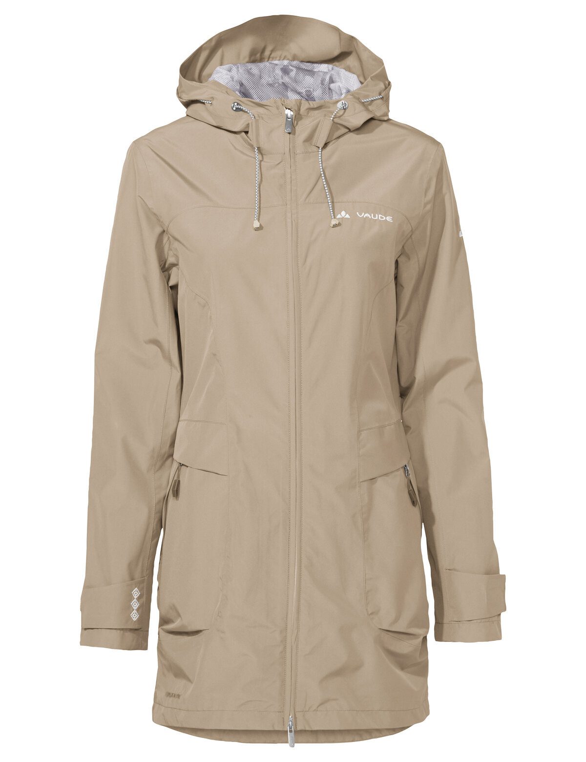 Moderner und nachhaltiger Damen Parka mit vielen praktischen Details #zwei geräumige Fronttaschen und eine Innentasche #leichtes, bedrucktes Innenfutter #komplett aus recycelten Materialien hergestellt Mit dem nachhaltigen Skomer Damen Parka können verregnete Sommertage kommen. Die wasser- und winddichte Jacke bietet zuverlässigen Schutz vor Nässe und Kälte - ob in den Bergen oder auf einem Städtetrip. Durch die verstellbare Kapuze, weitenregulierbare Ärmel und den von hinten abgedeckten Zwei-Wege-Reißverschluss gelangt kein Regen und keine Kälte ins Innere der Jacke. Sollte es mal etwas schweißtreibender werden, transportiert die atmungsaktive Membran Feuchtigkeit nach außen und sorgt so für ein angenehmes Trageklima. Praktisch sind auch die Innentasche und die beiden Fronttaschen mit wasserdichten Reißverschlüssen, in die Gegenstände wie Smartphone oder Geldbeutel trocken und sicher verstaut werden können. Bei aller Funktionalität sieht der Skomer Damen Parka auch noch sehr stylish aus. Sein taillierter Schnitt schmiegt sich schön an den Körper an und verleiht ihm eine feminine Optik. Mit dem Kordelzug an der Taille kann die Jacke zudem individuell eingestellt werden. Auch das bedruckte Innenfutter verpasst der Jacke einen modernen und urbanen Look. Der nachhaltige Damen Parka besteht zu 100 % aus recyceltem Polyester und wurde mit Eco Finish ohne Fluorcarbone (PFC) wasser- und schmutzabweisend ausgerüstet. Das VAUDE Green Shape-Label steht für ein umweltfreundliches, funktionelles Produkt aus nachhaltigen und bluesign® zertifizierten Materialien.