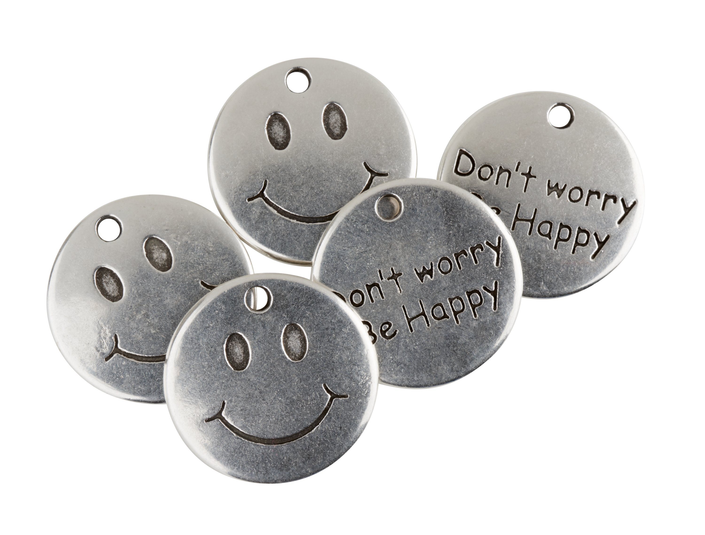 Witzige VBS Anhänger 'Be Happy' zweiseitig mit einem ca. 2 mm großem Loch zum Annähen und Befestigen. Auf der einen Seite ist eine lachender Emoji und auf der anderen ein Schriftzug. Super für viele Bastel-Ideen.