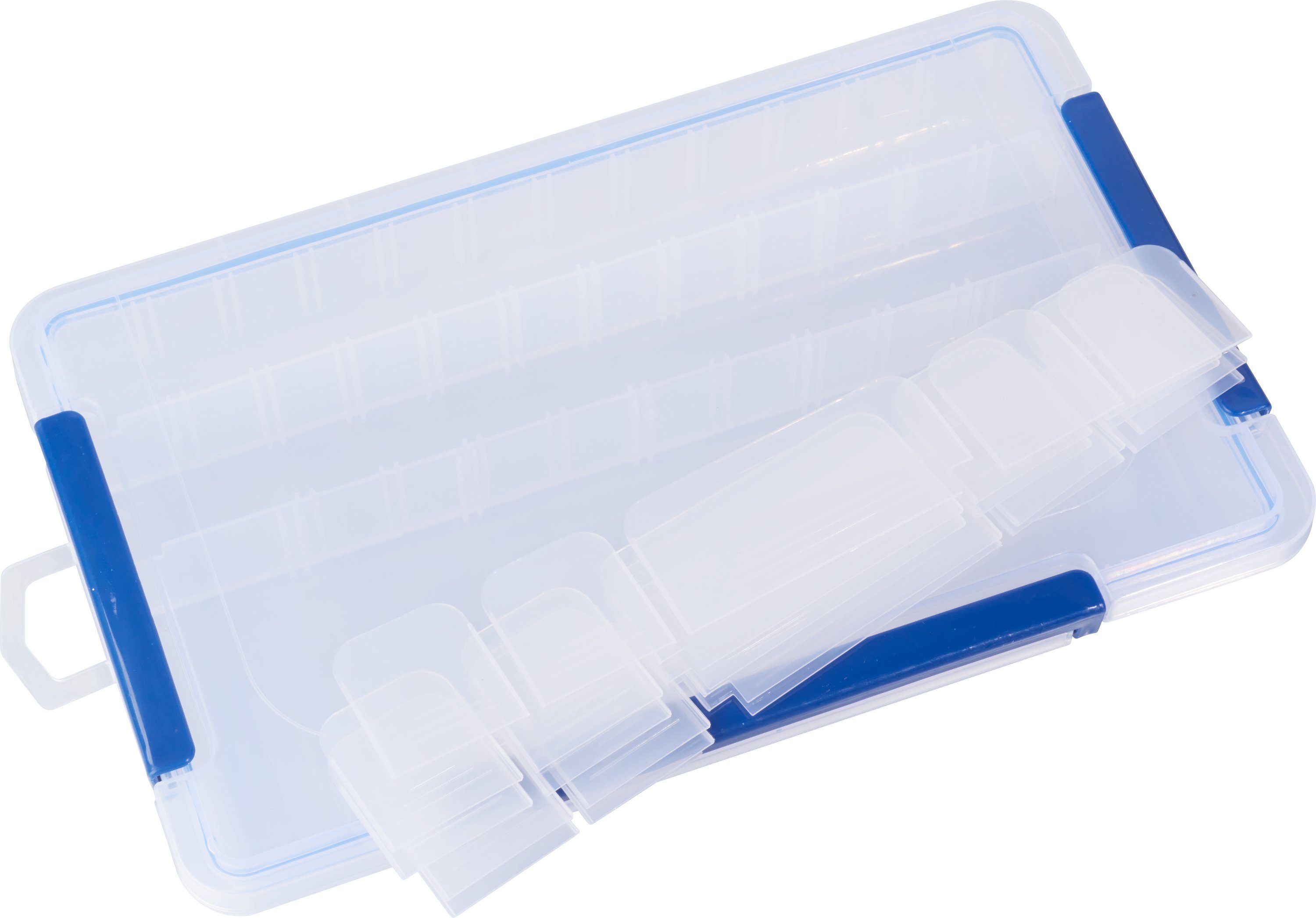 Eine VBS Sortierbox mit variabler Einteilung, Размер ca. 35 x 21,5 x 5 cm. Die Einteilung kann individuell gestaltet werden. In der Box sind zwei Abtrennungen fest eingebaut, Размер der Fächer ca. 4,3 cm x 32 cm. Das dritte Fach ist ca. 10 cm x 32 cm groß. Inklusive 5 großer (10 x 4,6 cm) und 20 kleiner (4,3 x 4,6 cm) Abtrennungen. Bestens geeignet für Bastelmaterial, Schrauben, Werkzeug, Nähutensilien und vieles mehr. Eine hochwertige und stabile Box für kleine Dinge.