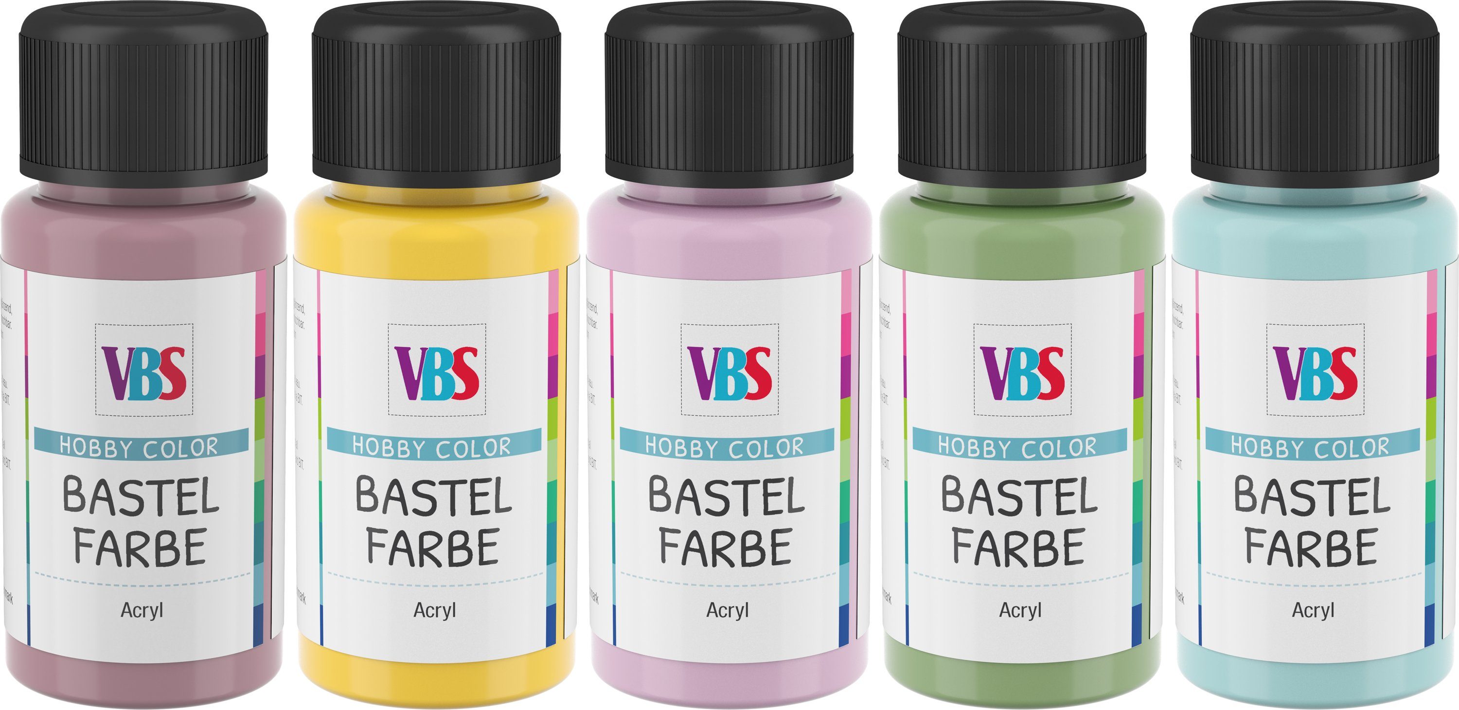 VBS Bastelfarben-Set 'Pastel poetry', 5 x 50 ml bestehend aus den zarten Farben Pastell-Rosa, Honiggelb, Lavendel, Antikgrün und Mint. Auf Wasserbasis, geruchsneutral, umweltfreundlich und wasserverdünnbar. Die Zusammenstellung aus hochwertiger Acrylfarbe ist deckend und lässt sich auf verschiedene Oberflächen auftragen und schablonieren. Perfekt für kreative Keilrahmen, Grußkarten, Geschenkverpackungen und weitere Basteleien. Schleifenband, Glitter, Streuteile und mehr sind eine klasse Ergänzung.